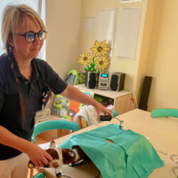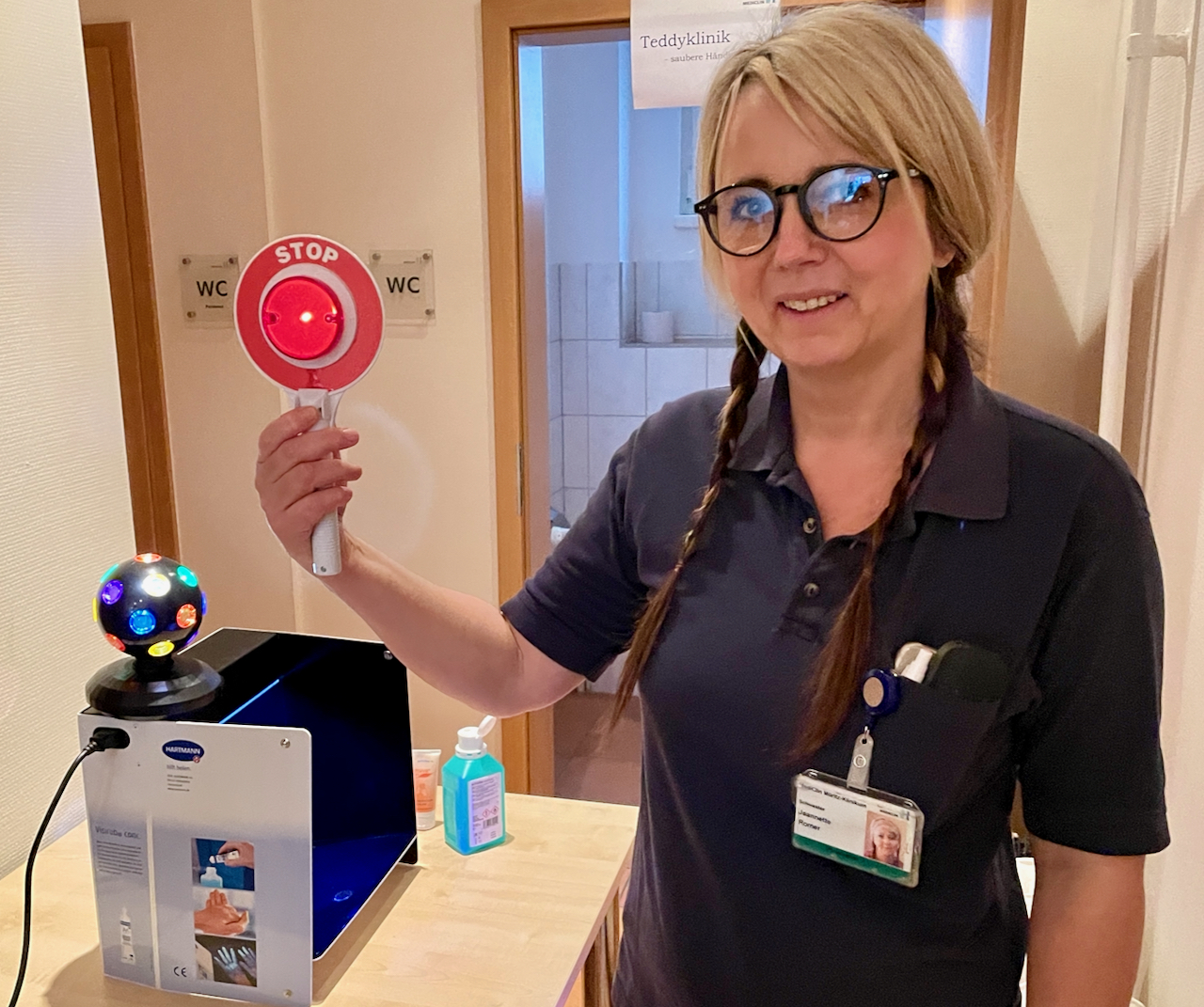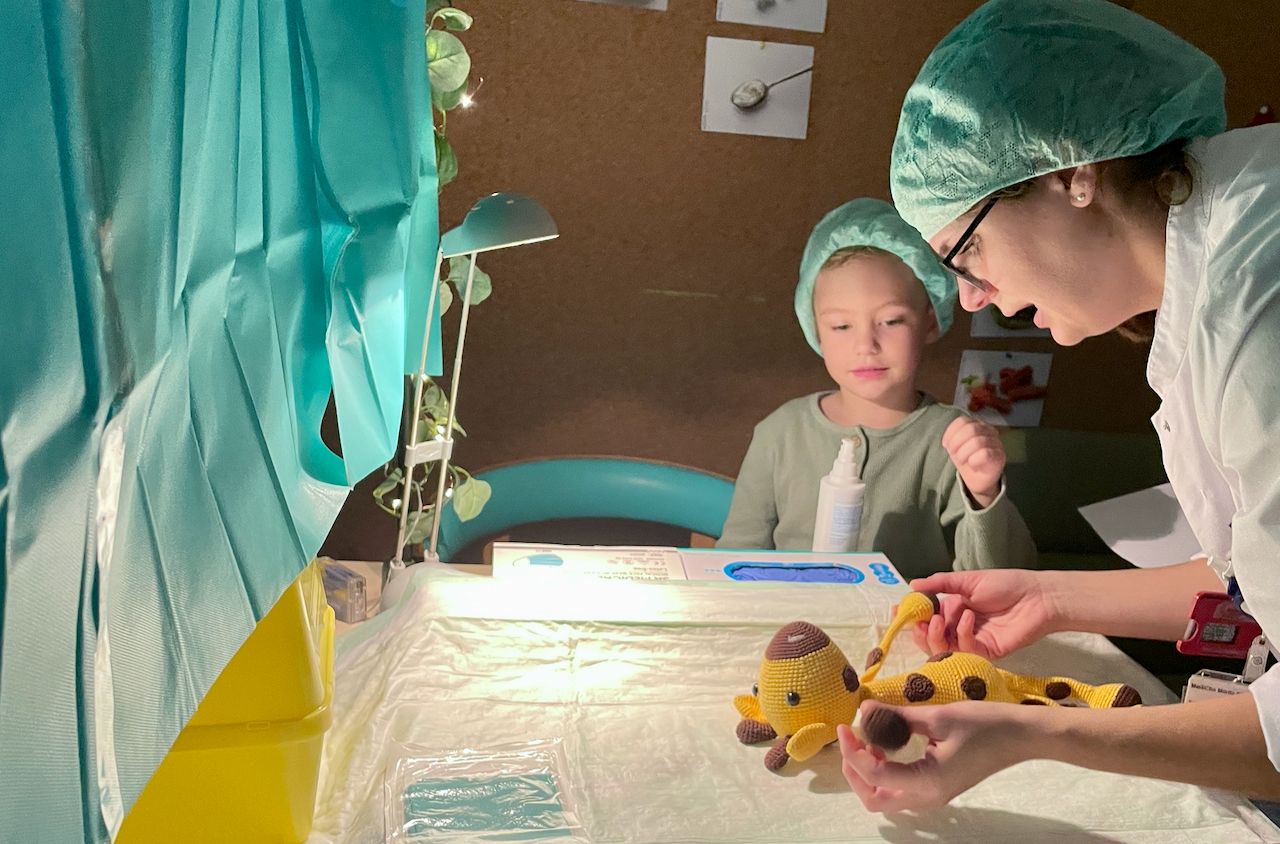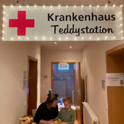 „Wir konnten die Teddyklinik aufgrund von Corona ja lange nicht anbieten, um so größer war unsere Vorfreude auf den heutigen Tag“, erzählt Praxisanleiterin Jeanette Romer, die zu den Organisatoren zählte. Gestern kamen die Mädchen und Jungen der benachbarten Kita „Kleine Weinbergschnecken“ mit ihren kranken Lieblingen in die Klinik. Zunächst schauten sie noch etwas unsicher, doch schon die nette Schwester Theresa an der Anmeldung – niedlich geschminkt – nahm ihnen jegliche Ängste, sofern sie denn überhaupt bestanden. Denn Hauptanliegen der „Teddyklinik“ ist zum einen, den Knirpsen die Angst vor dem Krankenhaus zu nehmen, und ihnen so ganz nebenbei auch noch einiges beizubringen. Wie beispielsweise das richtige Desinfizieren der Hände.