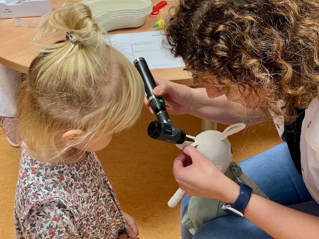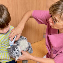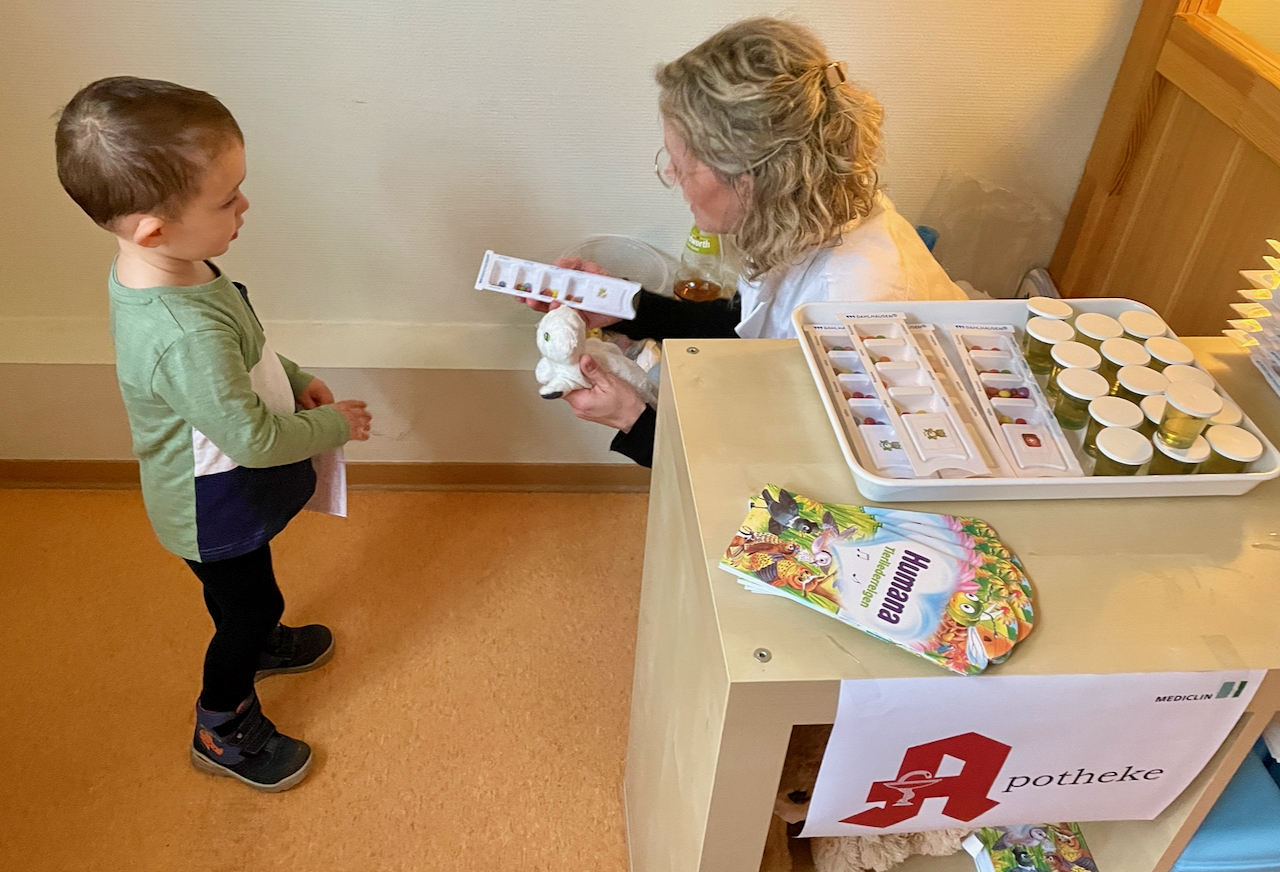 „Hier die Medizin, die Du schon mal für Dein Kuscheltier probieren kannst.“ – „Nein, ich darf von anderen keine Medizin nehmen.“ Gut gelernt und gut behalten, kann man da nur sagen.