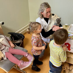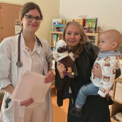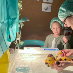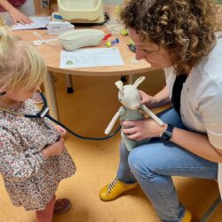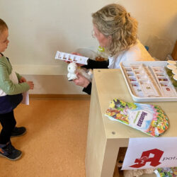 Bei anderen Kuscheltieren reichte zum Glück das Abhorchen, Fiebermessen oder ein fachmännischer Blick in die Ohren bei Fachärztin Kathleen Schulz von der Kinderklinik. Dennoch: Alles muss seine Ordnung haben, und so ging’s für die plüschigen Patienten auch immer zu Zopf-Schwester Ilka auf die Waage und zum Maßband. Erst dann gab es ein Rezept, mit dem die Kita-Kinder in die Apotheke zu Schwester Kristina marschierten. Dort erhielten sie entweder bunte Pillen – in diesem Fall Smarties – oder einen Schmerztrunk, der verdächtig nach Apfelsaft schmeckte. Und – jedes Kind verließ die Teddy-Klinik nicht nur mit dem eigenen Kuscheltier, sondern bekam noch eins dazu.