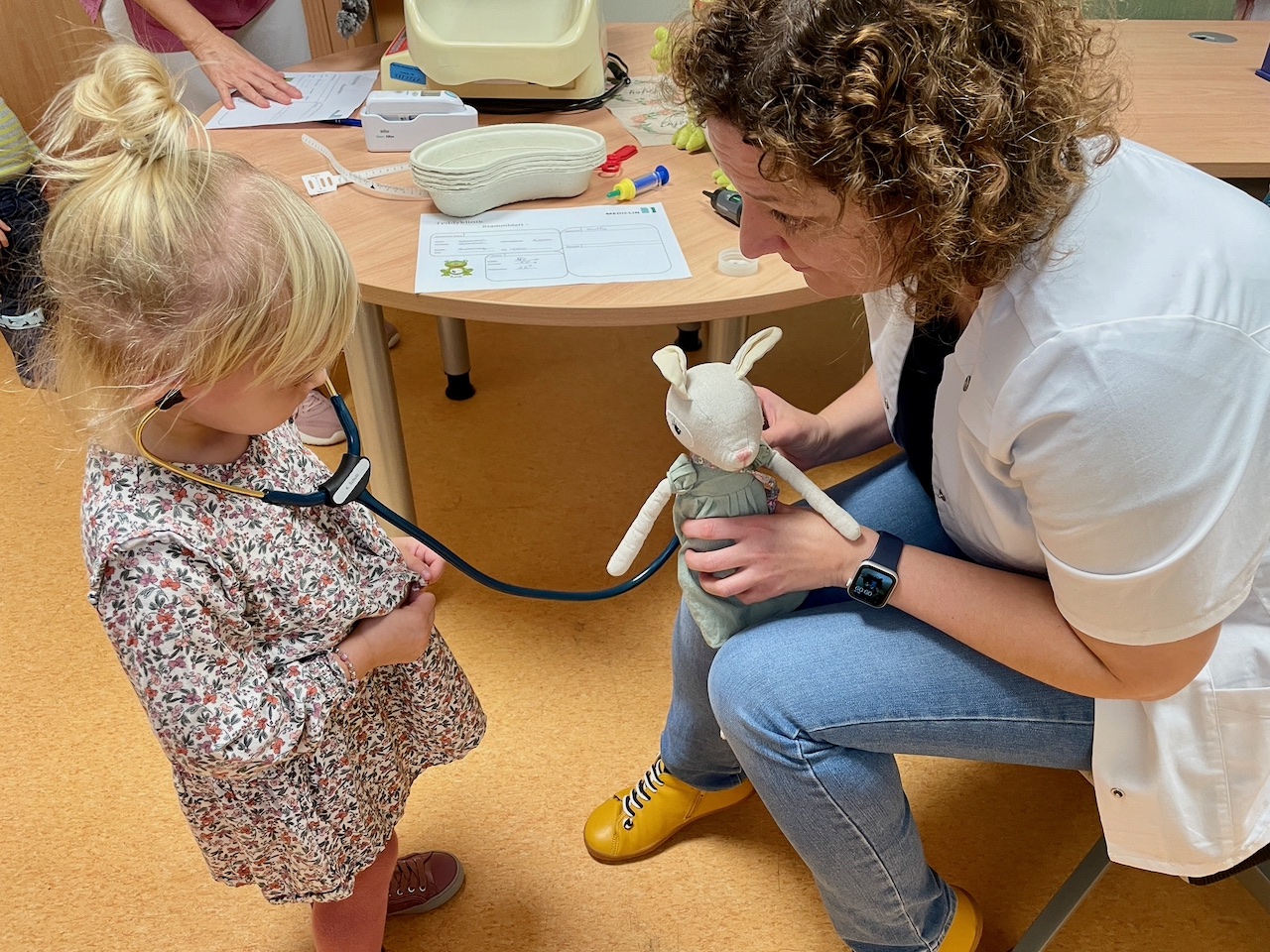 „Unser Geschäftsführer Sven Hendel fand unsere Idee gleich gut, ließ uns freie Hand und hat die Teddys spendiert“, berichtet Jeanette Romer, die gestern als „Frau Dr. Pille mit der großen klugen Brille“ daher kam. Auch Dr. Kathrin Kretschmer, kommissarische Leiterin der Kinderklinik, nahm sich die Zeit und besuchte ihre besonderen Patienten auf der Extra-Station. Da hatten Püppi und Co. doch tatsächlich so etwas wie eine Chefarzt-Behandlung.