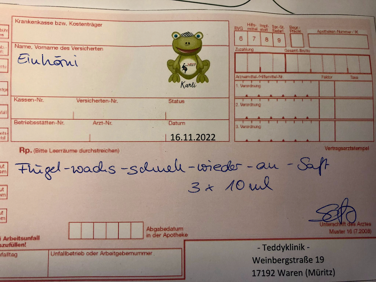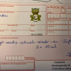 „Was hat denn Deine Kuscheltier für eine Krankheit?“ – „Keine“. Auch gut, musste sich der Schnuffel eben nur einer Vorsorge-Untersuchung unterziehen.