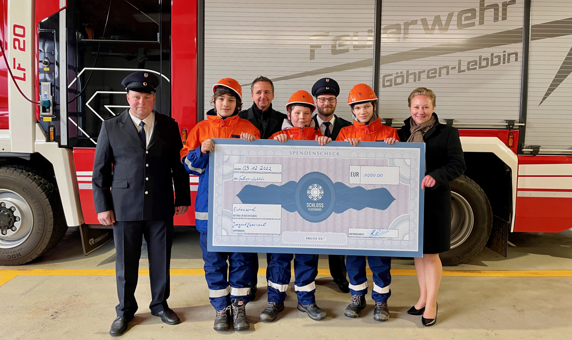 „Für uns ist es wirklich eine Herzensangelegenheit, die Feuerwehr, die Ehrenamtlichen und die kleinen Nachwuchsretter zu unterstützen. Deshalb freuen wir uns, dass wir heute diesen 1000-Euro-Scheck übergeben können“, so Kathrin Röder als General Managerin des Schlosshotels Fleesensee.