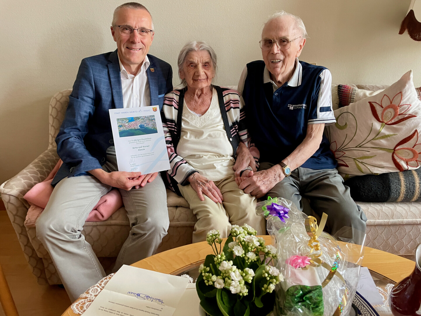 Das hat es seit mehr als 33 Jahren in Waren nicht mehr gegeben: Eine Kronjuwelenhochzeit. Berta und Werner Kletzin aus Waren haben dieses seltene Jubiläum in diesen Tagen gefeiert. Sie sind sage und schreibe seit 75 Jahren verheiratet. Klar, dass auch Warens Bürgermeister Norbert Möller unbedingt zum Gratulieren vorbeischauen und mit dem Paar plaudern wollte. Denn die Jubilare haben einiges zu erzählen – inclusive Tipps, wie man es schafft, so lange gemeinsam durchs Leben zu gehen, noch immer liebevoll übereinander zu reden und gerne Händchen zu halten. Bis zum Herbst vergangenen Jahres haben Berta und Werner Kletzin noch am Stauffenbergplatz in Waren gelebt, doch dann ging’s alleine nicht mehr so gut, so dass die Beiden in den Ansgar Wohnstift nach Amsee zogen. Dort leben sie jetzt aber auch weitgehend eigenständig und zufrieden.