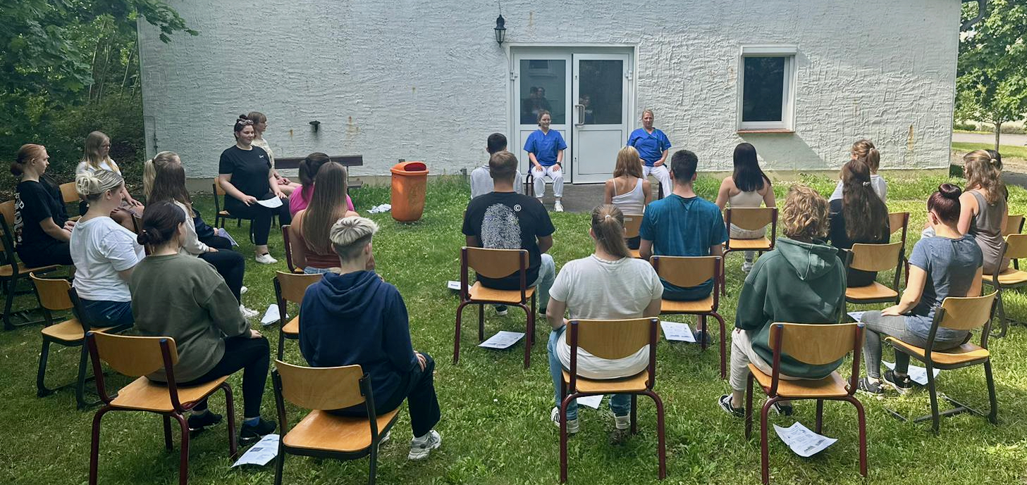 An den gerade laufenden Einführungstagen erlangen die „frischen Auszubildenden“ erste Grundkenntnisse, lernen die Struktur der Klinik kennen und erhalten verschiedene Schulungen, zum Beispiel zum Arbeitsschutz, zur Hygiene und zum Brandschutz. Bei Selbsttest werden sie dafür sensibilisiert, wie es ist, Patient im Krankenhaus zu sein. Die Schüler reichen sich beispielsweise untereinander Essen und sollen ein Gespür dafür bekommen, wie sich hilfebedürftige Menschen fühlen.