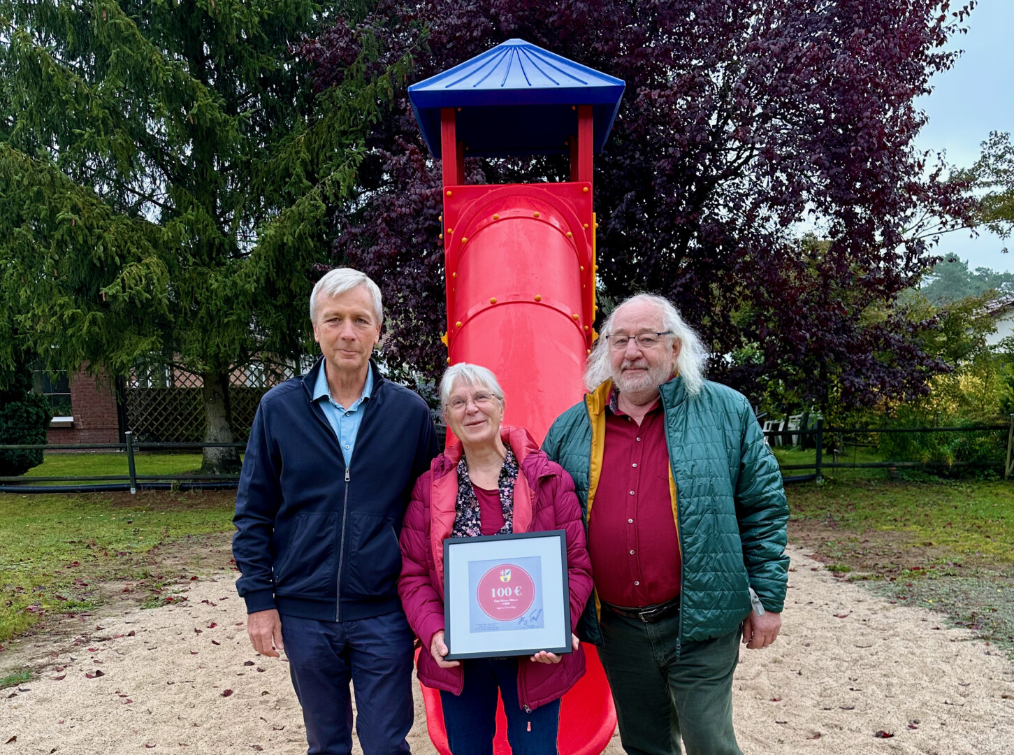 Foto: Ingelore Festerling (Mitte) und Ehemann Christian (rechts) gemeinsam mit Bürgermeister Henry Tesch an der neuen Rutsche, zu der sie beigetragen haben.