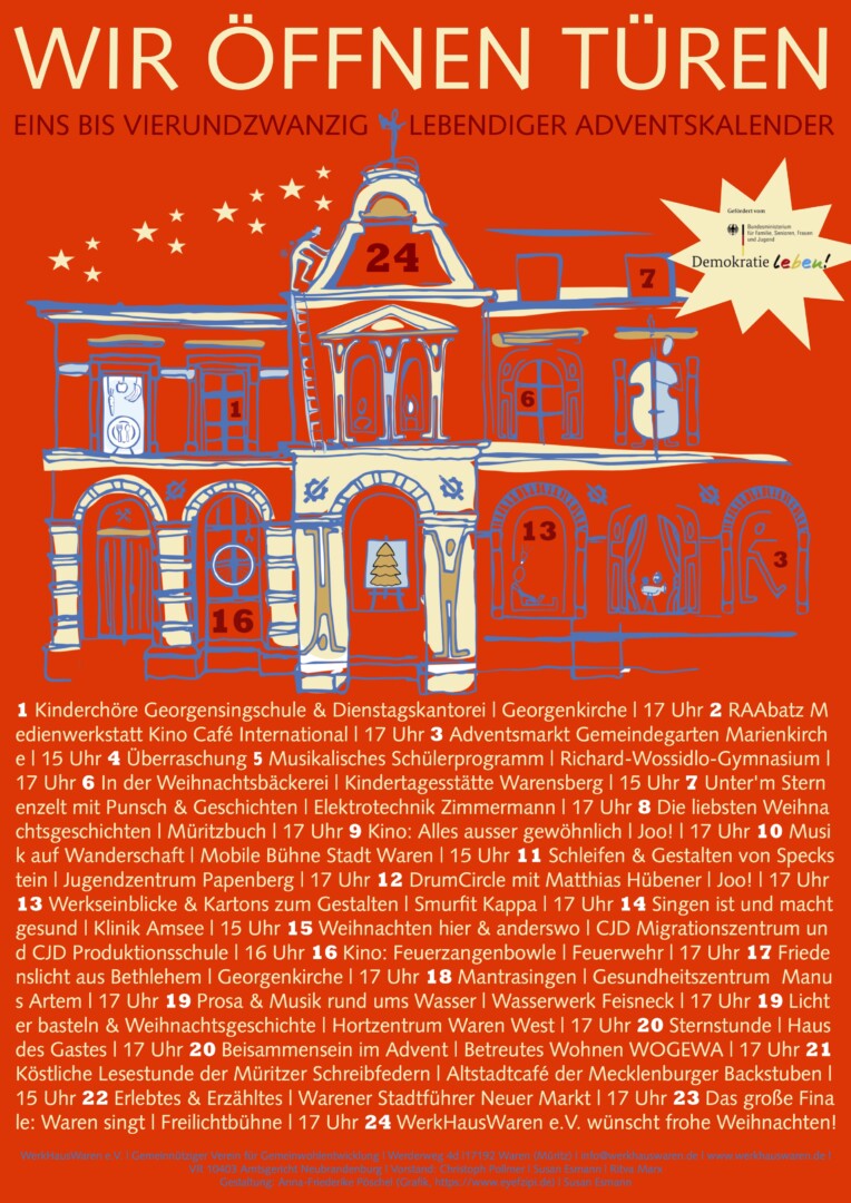 Die genaue Übersicht über die Gaben und Aktivitäten an jedem Tag ist auf der Vereinsseite www.WerkHausWaren.de sowie unter www.lebendiger-adventskalender.net zu finden. Dort will der Verein auch täglich vom jeweils geöffneten Türchen berichten.