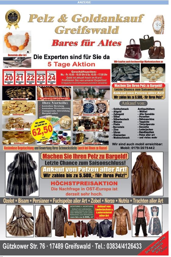 Vergangene Woche haben sie dank geschalteter Anzeigen in lokalen Tages- und Wochenzeitungen nach Greifswald in die Gützkower Straße locken können. Ihr Muster ist simpel: Die reisenden „Händler“ mieten bundesweit leerstehende Räume für einen bestimmten Zeitraum an. Kleingedruckt ist die Bedingung zu finden: Wer Pelze, Taschen, Antikes und Co. verkaufen will, muss Gold mitbringen. In allen Fällen werden die Teile geschätzt und völlig unter Wert angekauft. Echtes Gold wird als angeblich „nur vergoldet“ abgetan, für Pelze, die im Ausland gut 1.000 Euro oder mehr bringen, geben sie dem Eigentümer lediglich 40 Euro.