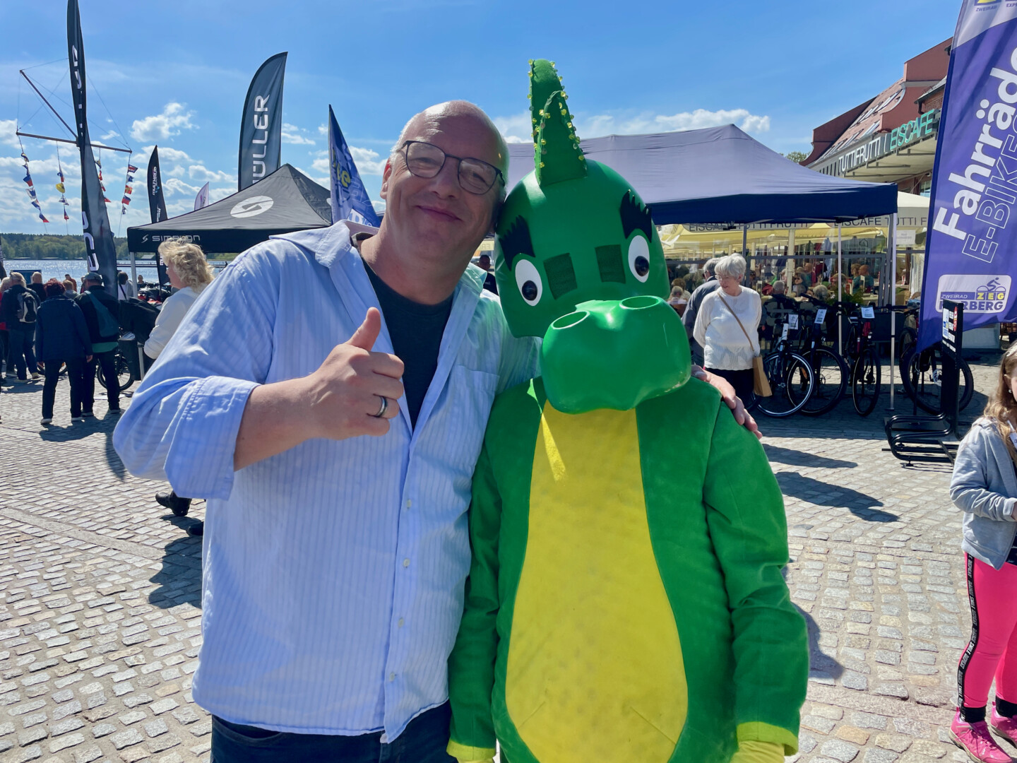 Aber nicht nur Autos gab’s gestern auf der Messe zu sehen. Erstmals dabei – Versicherungsmakler Griebsch – seit 33 Jahren am Markt ist. Das Unternehmen hatte den Tabaluga-Drachen dabei, an dem selbst FDP-Mann Toralf Schnur nicht vorbei kam. Er outete sich als Fan. Außerdem gab’s eine Tombola, deren Erlös an die Löschfüchse der Warener Feuerwehr geht.