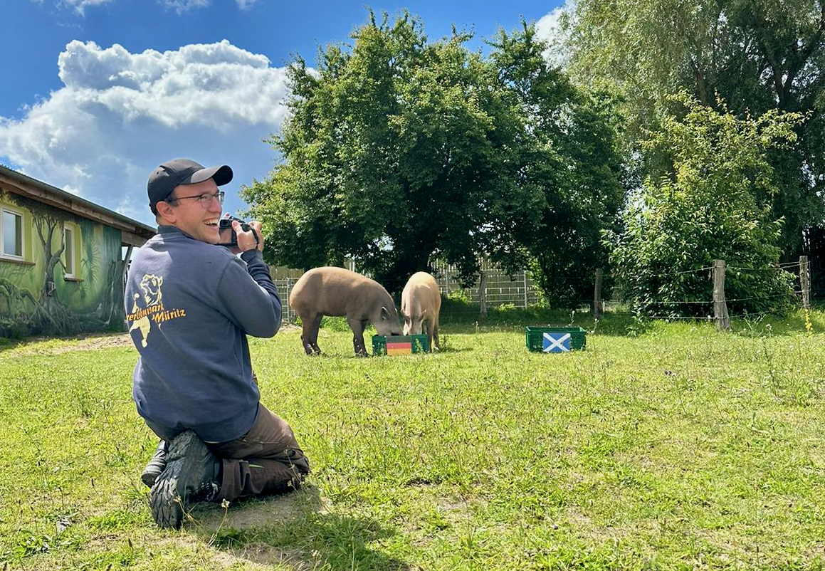 Auch die Müritz-Region hat ein EM-Orakel. Nein, stimmt nicht. Wir haben zwei: Die Tapire Pablo und Miriam aus dem Tierlebnispark Müritz in Grabowhöfe sind unsere Fußball-Experten. Und natürlich wurden sie auch schon zum heutigen Eröffnungsspiel befragt.“Pablo und Miriam hatten große Freude beim Erobern der Futterkörbe. Stürmisch und zielsicher haben sich die beiden Südamerikaner mit ihrer Rüsselnase auf den – wie sollte es auch anders sein – Deutschland-Korb gestürzt. Wenngleich Pablo durchaus auch zum Schottland-Korb geschielt hat, wie die Fotos zeigen, so blieben doch beide standhaft bei ihrer ersten Wahl. Wir hoffen also, dass unsere Tapire einen guten Riecher bewiesen haben und Deutschland das Auftaktspiel gewinnt“, so David Fuhlbrügge vom Tiererlebnispark Müritz (Foto links). Er hatte die Idee, Pablo und Miriam als Orakel einzusetzen und sich dann beim Fotografieren richtig ins Zeug gelegt.