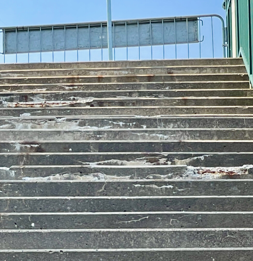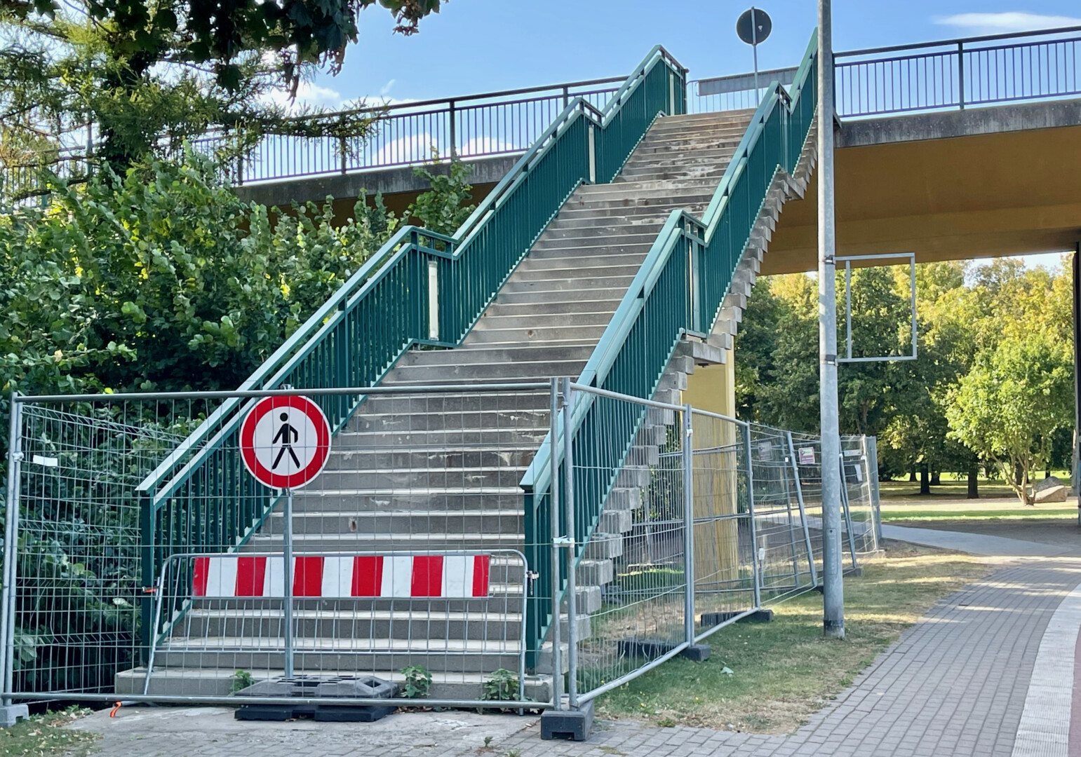 In diesem Bereich führen starke Abplatzungen nach Auskunft der Verwaltung in den Laufflächen zu Gefahrenstellen, die beseitigt bzw. repariert werden müssten. Aus verkehrssicherungspflichtigen Gründen wurde die Treppenanlage vorsorglich gesperrt.