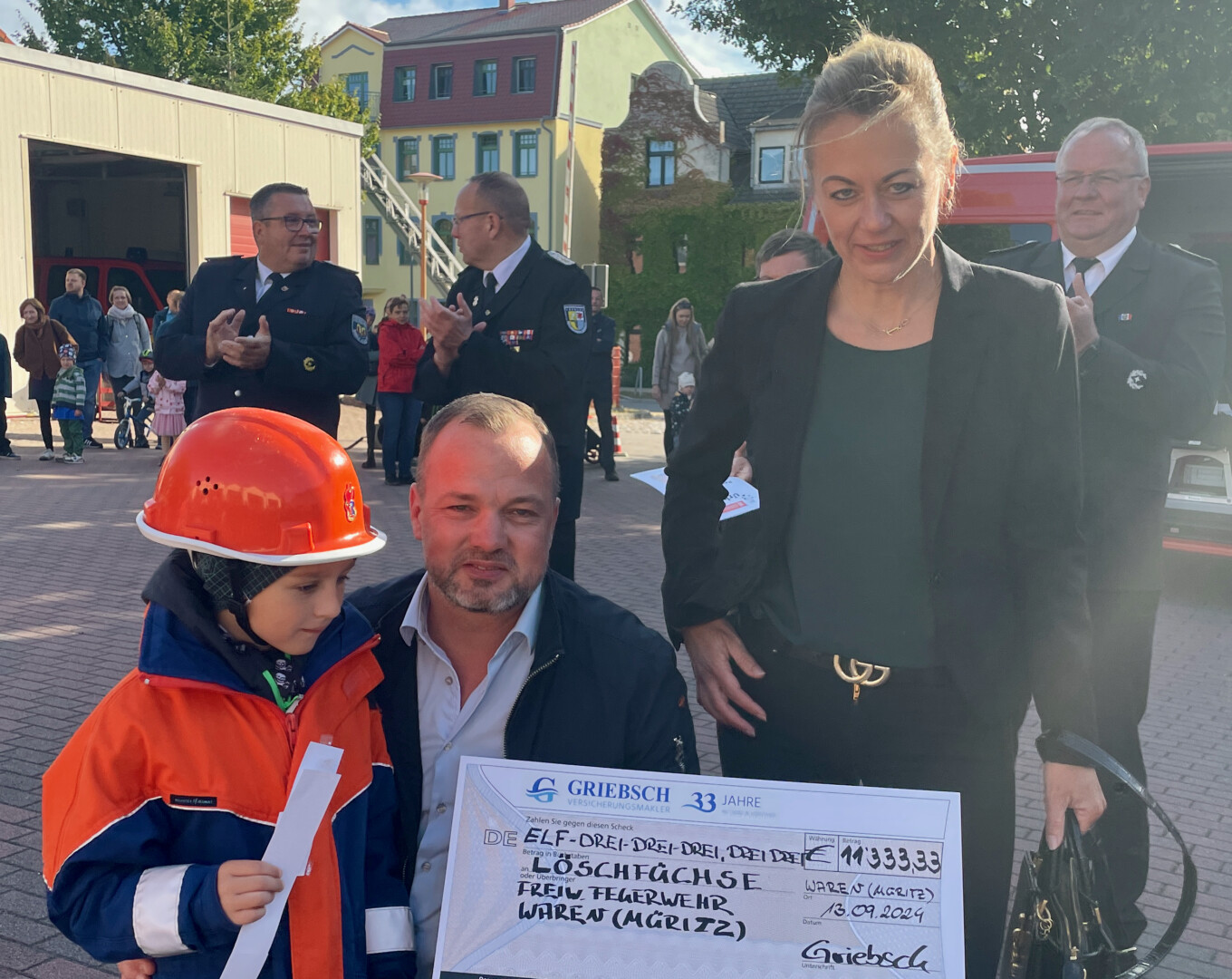 Stolze 11 333,33 Euro überreichten Tino Griebsch und Stefanie Bellan an die Warener Feuerwehr. So einen Scheck gab’s wohl noch nie. „Wir wissen das Geld gut angelegt, dann die Mini-Retter sind unsere Feuerwehrleute von Morgen. Zudem sorgen die Freiwilligen mit der frühen Ausbildung auch für eine sinnvolle Freizeitbeschäftigung und stärken schon sehr früh das Gemeinschaftsgefühl und die Kameradschaft“, so Tino Griebsch.
