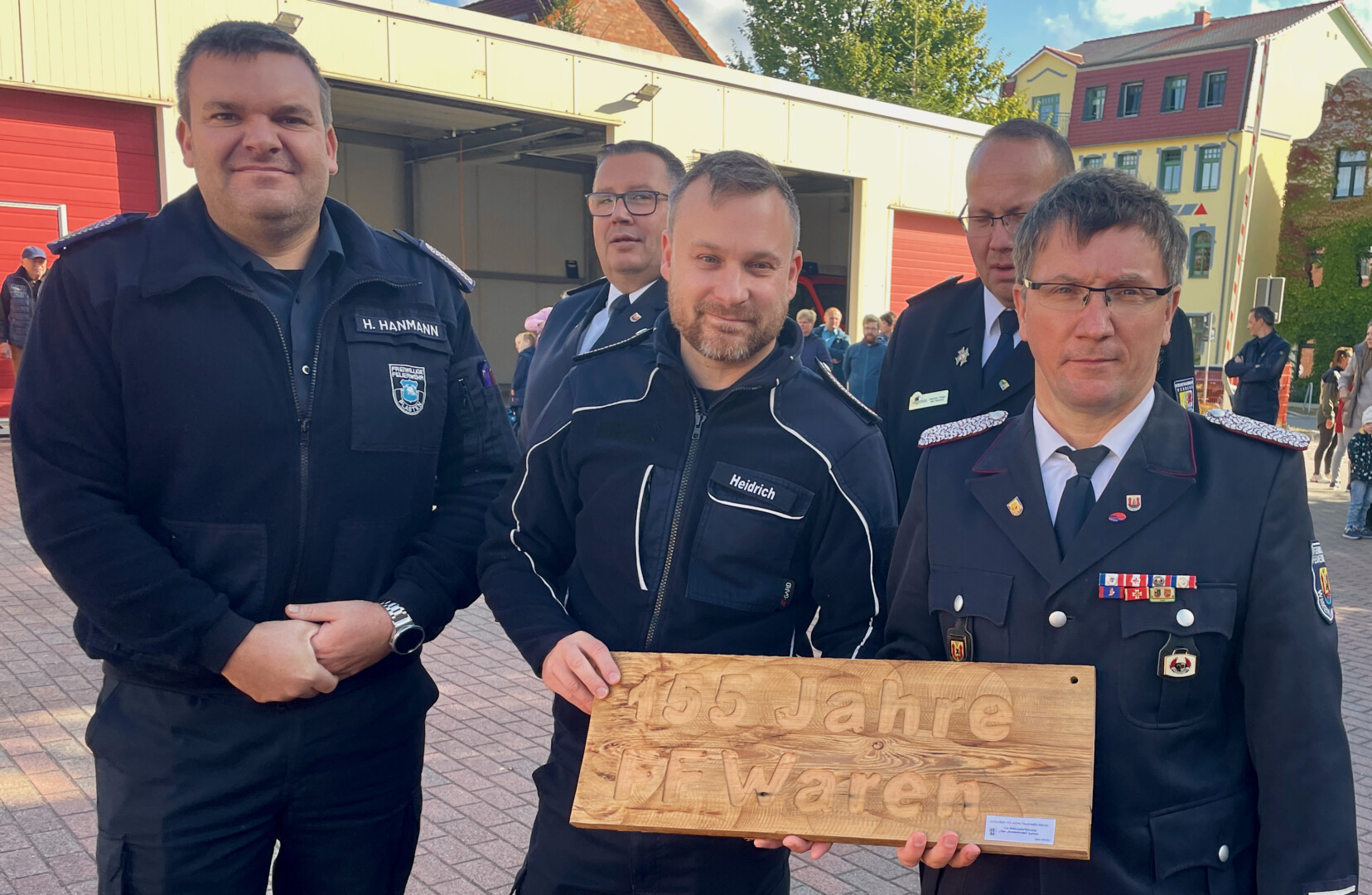 Das Amt Seenlandschaft wollte ebenfalls seinen Dank für die jahrelange gute Zusammenarbeit ausdrücken. Die Wehren im Umkreis von Waren unterstützen sich regelmäßig gegenseitig. Von Amtswehrführer Jan Heidrich gab’s ein selbst gemachtes Holzschild mit dem Schriftzug „155 Jahre Feuerwehr Waren“.