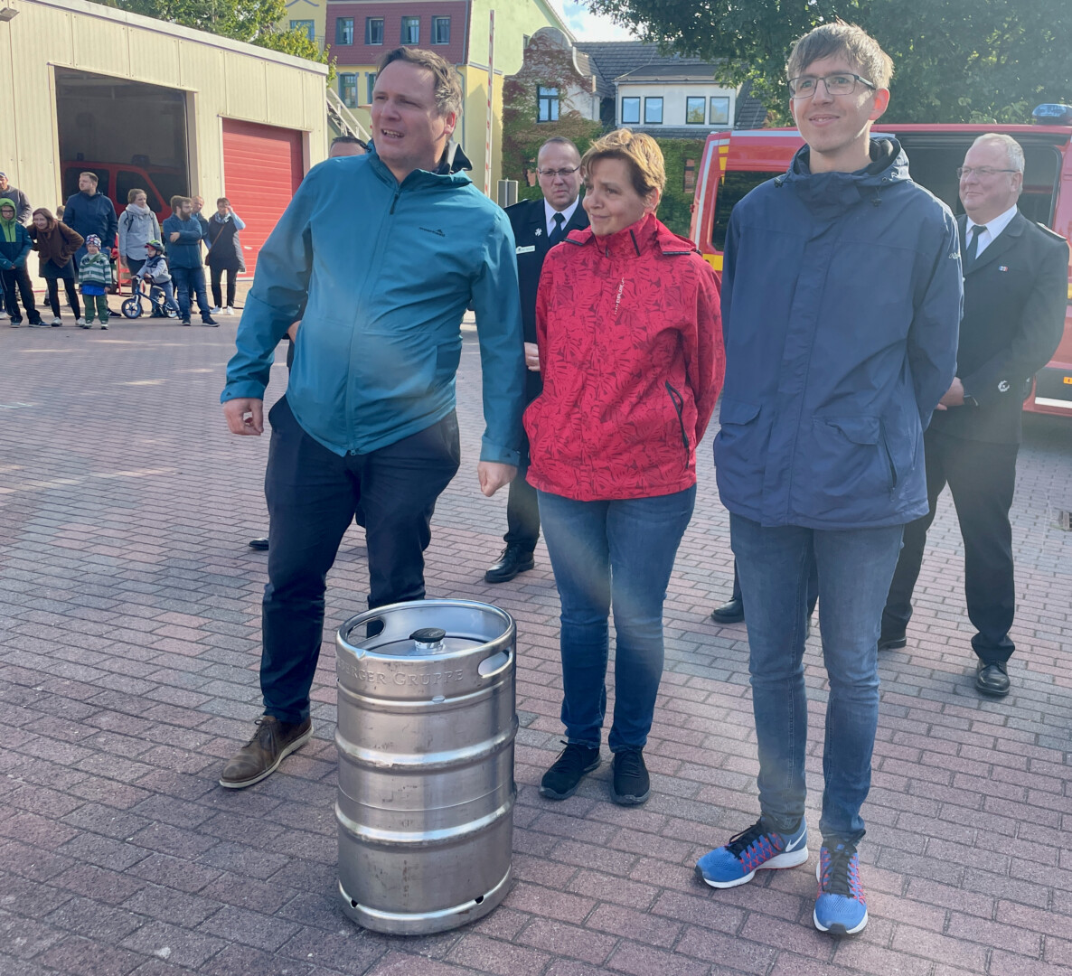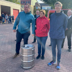 Doch damit noch nicht genug der Geschenke. Benjamin Nofz vom Wassersport e.V. und seine Mitstreiter hatten schwer zu tragen. Sie überreichten ein Fass Radeberger Bier – auch als Dankeschön für die zuverlässige Unterstützung beim jährlichen Müritzschwimmen.