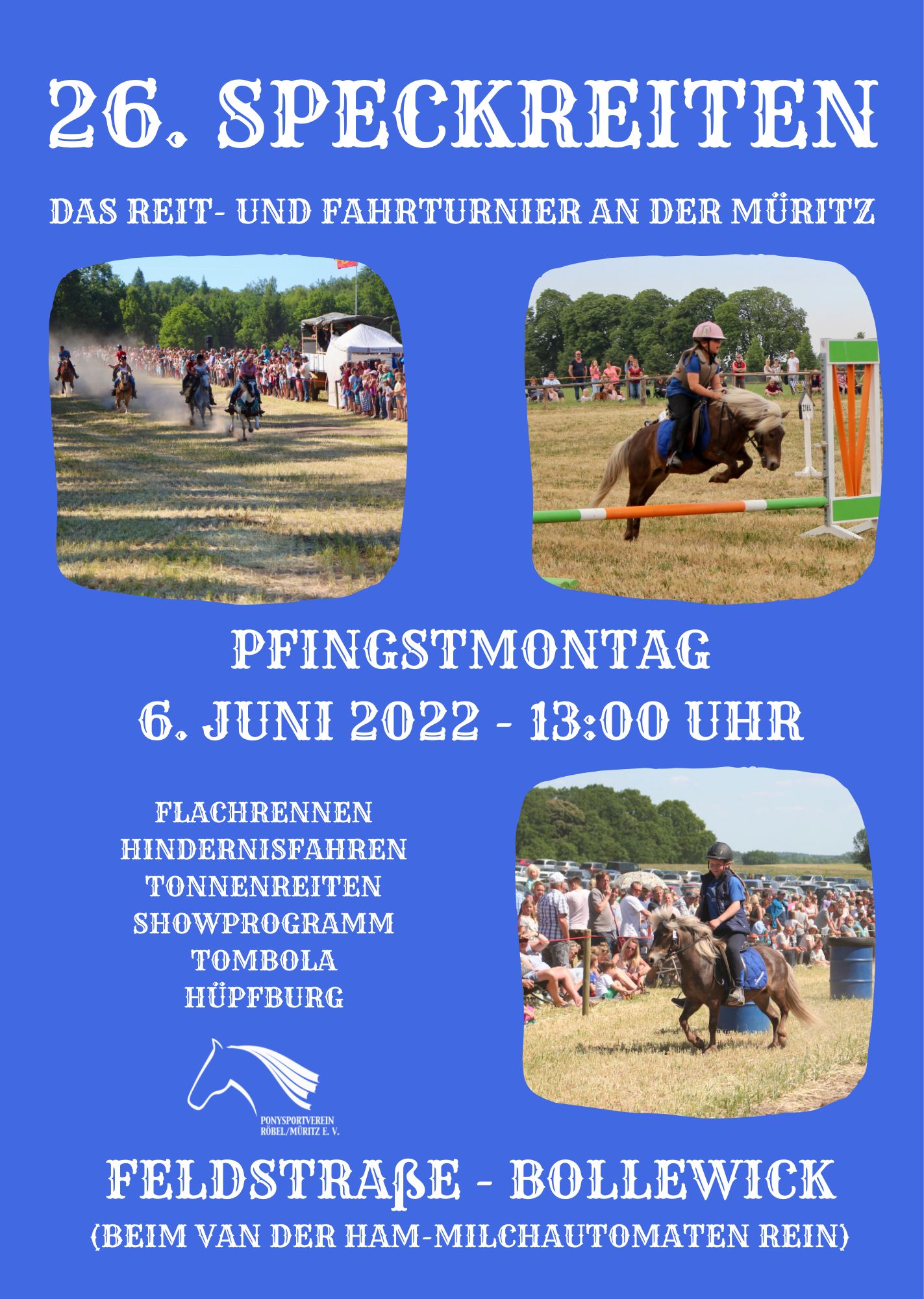 Am Pfingstmontag, 6. Juni, um 13 Uhr geht in Röbel wieder los. Das 26. Pfingstturnier „Speckreiten“ unter der Regie des Ponysportvereins Röbel/Müritz e.V. findet in diesem Jahr an der Feldstraße in Bollewick statt. Eine große Bandbreite an Reit- und Fahrprüfungen und ein ebenso breit gefächertes Teilnehmerfeld versprechen dem Zuschauer ein abwechslungsreiches und interessantes Pferdesport-Ereignis.