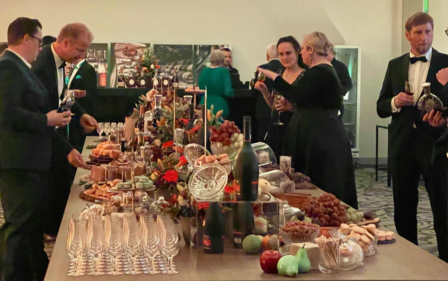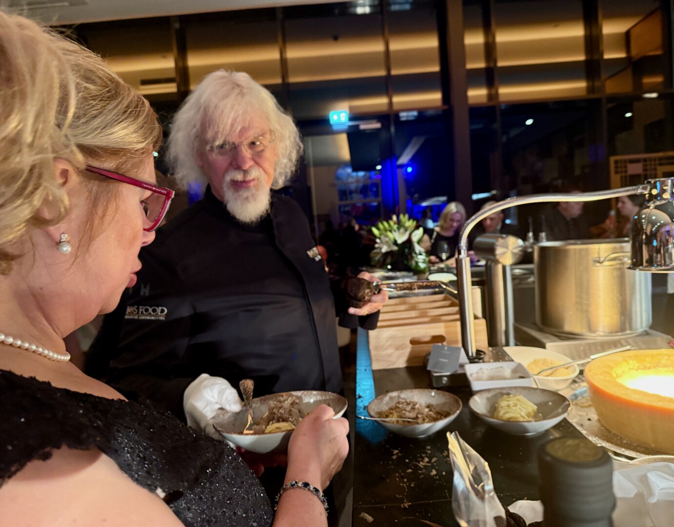 Küchenchef Christian Braun und sein Team verwöhnten die Gäste mit einem kulinarischen Angebot der Extraklasse. Gemeinsam mit Deutschlands „Trüffelpapst“ Ralf Bos kreierten sie an verschiedenen Food-Stationen eine harmonische Symbiose aus regionalen und internationalen Köstlichkeiten. Von fangfrischem Fisch aus der Müritz bis zu den handgefertigten Pralinen der Schokoladerie Juliet de Prie – die Auswahl ließ keine Wünsche offen. Ergänzt wurde das Angebot durch langjährige Genuss-Partner, die erlesene Weine und Spirituosen an Verkostungstischen präsentierten. Das Besondere: Zur Schloss-Küchencrew gesellen sich extra für den Flanierball Jahr für Jahr viele „Ehemalige“, die es sich einfach nicht nehmen lassen wollen, die Gäste beim Flanierball zu verwöhnen.