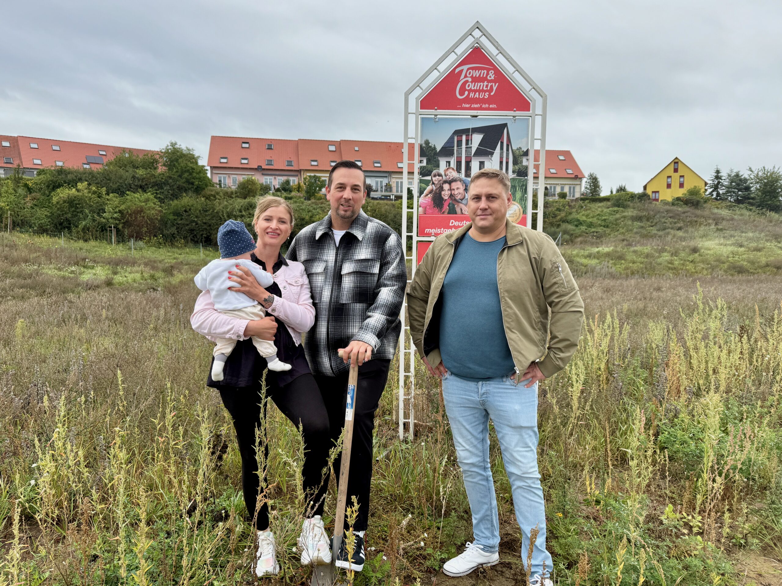 Foto oben: Diana Bugrell und Björn Knüppel, die sechs Monate alte Lina und mkm-Geschäftsführer Marcus Kubanke beim ersten Spatenstich für das neue Haus.