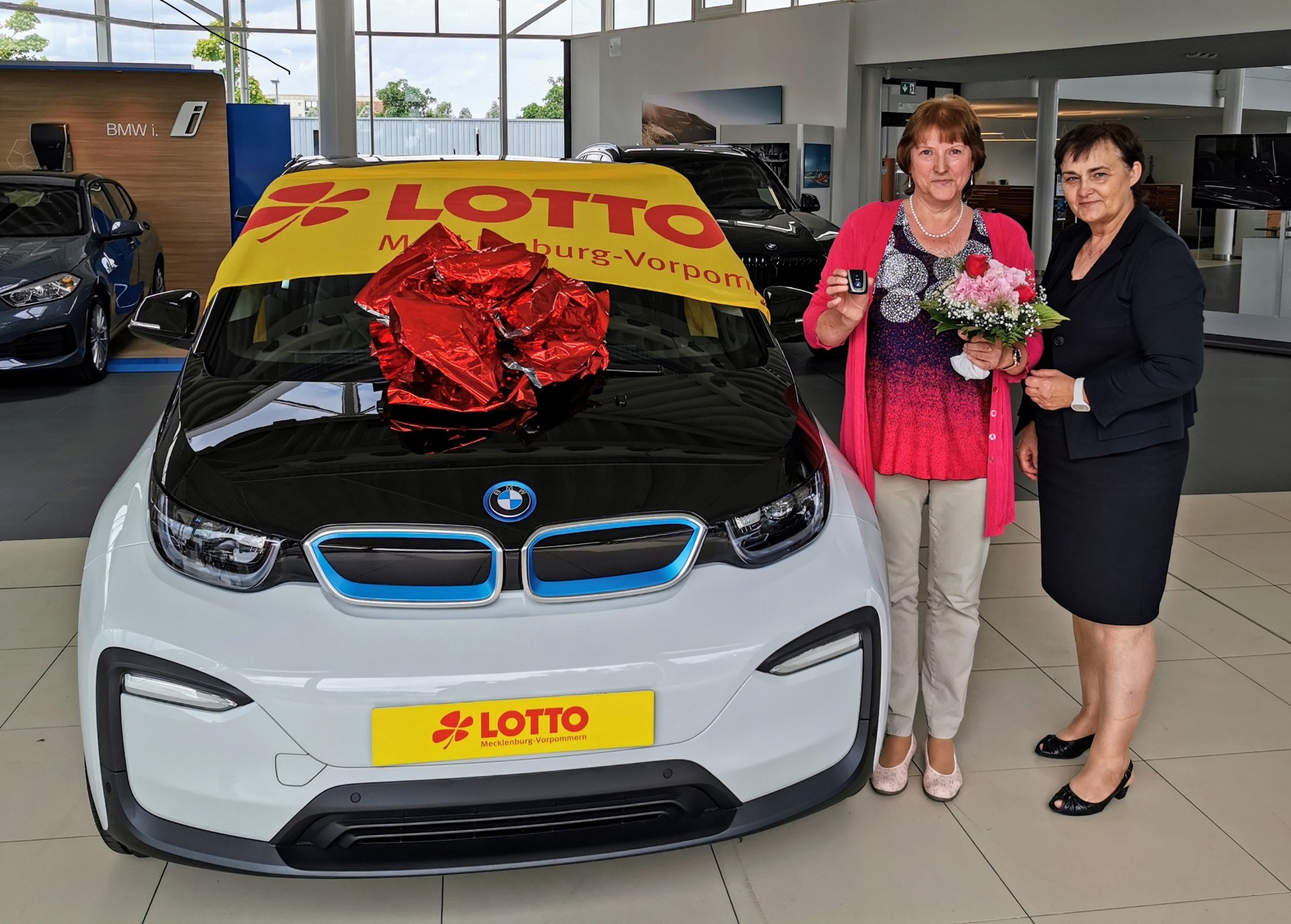 Bild: Im Mai 2020 hatte Marion Buzin (l.) aus Wittenförden über die KENO-Sonderauslosung einen BMW i3 gewonnen. Die Autoschlüssel überreichte Gabriele Rühle, damalige Prokuristin von Lotto MV, im Rostocker Autohaus.