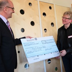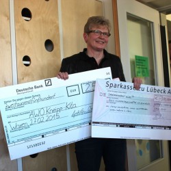 Auch Klinik-Chef Roland Grabiak ist froh über die neue Kita in Reichweite des Krankenhauses. Mit so einer Einrichtung in der „Hinterhand“ sei es nämlich leichter, neue Mitarbeiter zu überzeugen. Der Geschäftsführer kam zur Eröffnung nicht mit leeren Händen. Während eines Mitarbeiterfestes sind die Geschenke, die das Krankenhaus zum 100. Geburtstag bekommen hat, verlost worden. Den Tombola-Erlös in Höhe von 2500 Euro gab’s als Starthilfe für die 21. AWO-Kita. Weitere 300 Euro spendierte Architekt Erik Heske.
