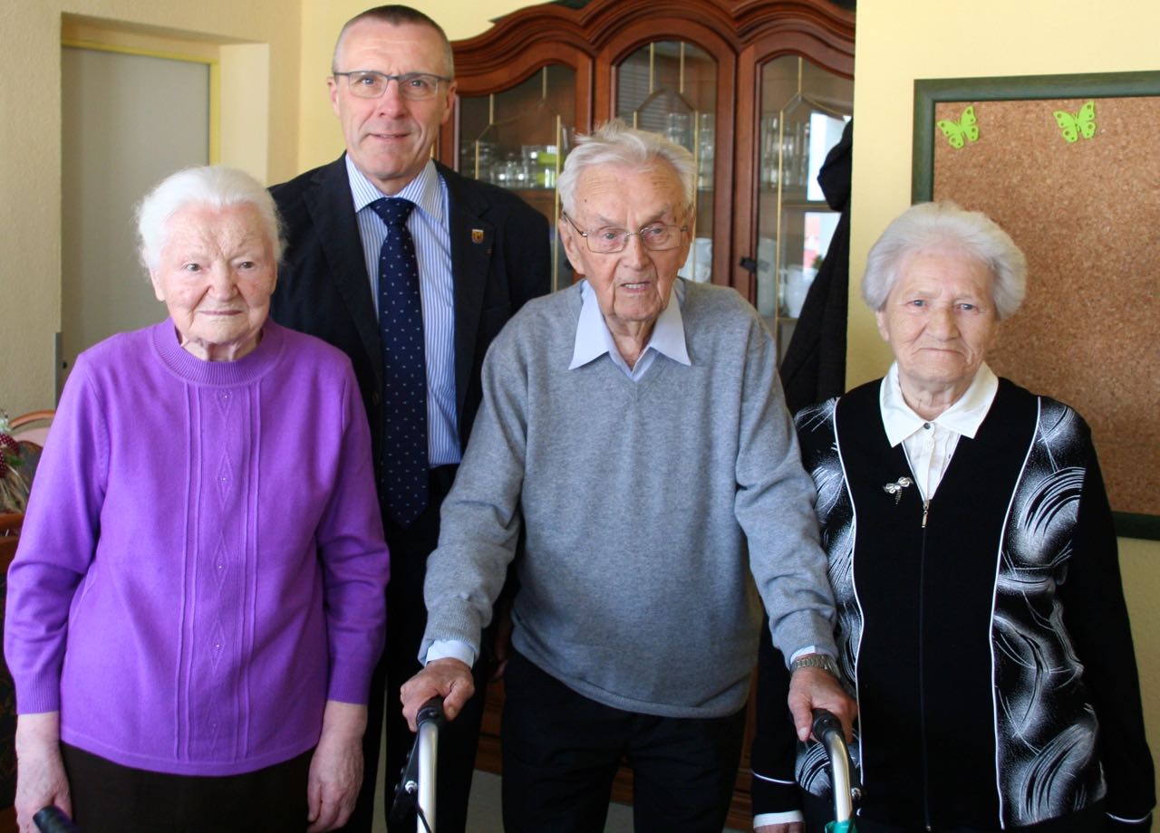 Der jüngste im 100er-Trio ist Kurt Schamel, der heute seinen 100. gefeiert hat. Links neben ihm die älteste, wenn man das bei einer Frau so sagen darf: Berta Schröder. Sie, Baujahr 1916, wird im August dieses Jahres bereits 101 Jahre. Und rechts neben dem heutigen Jubilar Lilly Gruel, die im Januar 100 Jahre alt geworden ist.
