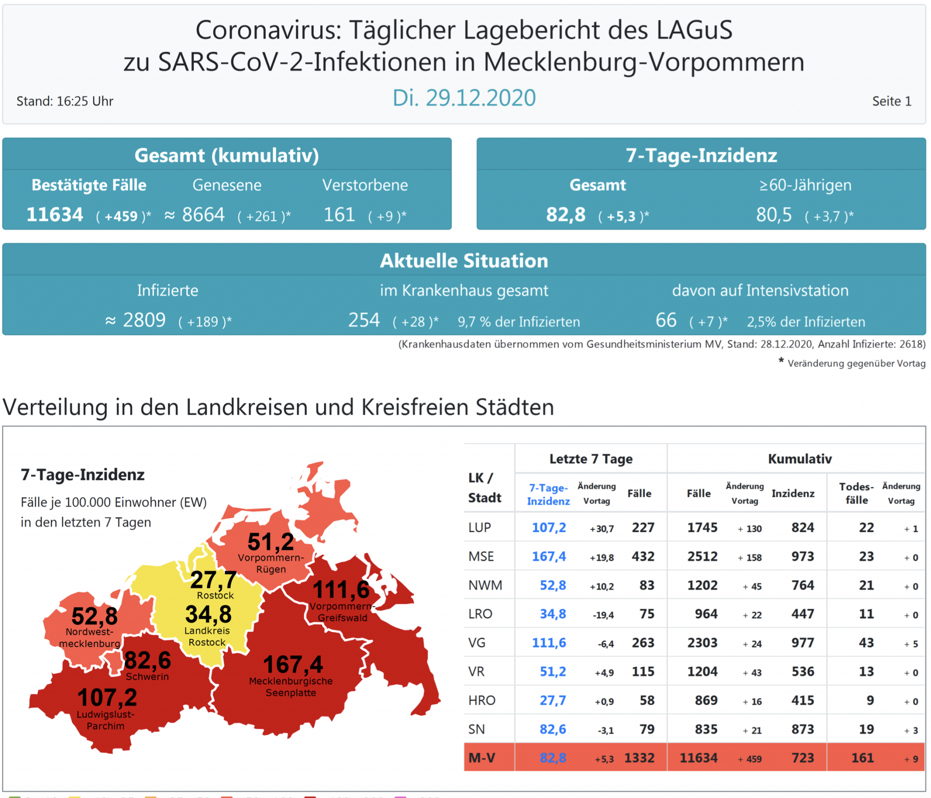 Insgesamt wurden in Mecklenburg-Vorpommern bisher 11 634 Infektionen festgestellt. Im Land gab es bislang 161 Todesfälle, neun mehr als gestern.