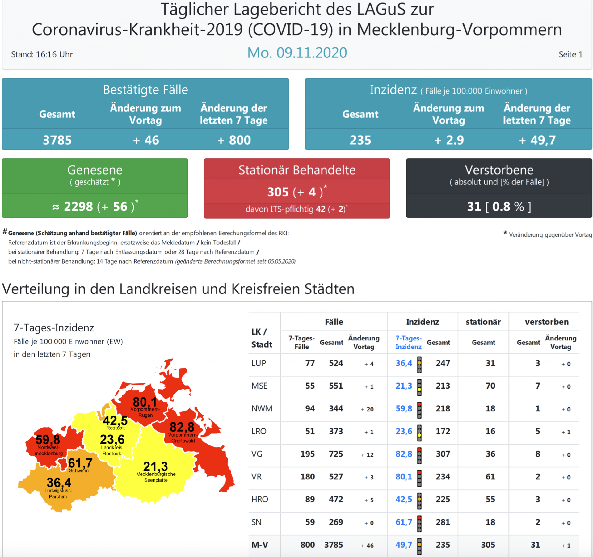In Mecklenburg-Vorpommern sind bis zum Nachmittag 46 neue Corona-Infektionen registriert worden, davon 1 im Landkreis Mecklenburgische Seenplatte. Die Landkreise Vorpommern-Greifswald, Nordwest Mecklenburg und Vorpommern-Rügen sowie die Stadt Schwerin überschreiten die 50-er Grenze. Deutlich angestiegen ist auch die Zahl der Covid-19-Patienten, die in Krankenhäusern und auf Intensivstationen behandelt werden.