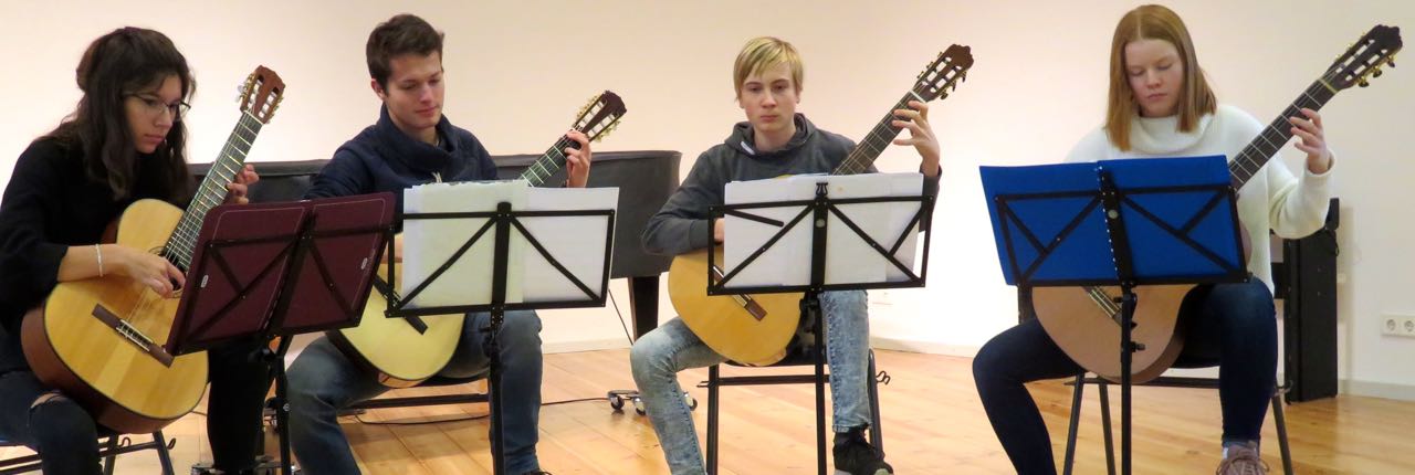 Niclas Herrmann, Cara Ronja Fedler, Nele Berghoff und Simon Sprigode im Gitarrenquartett aus Waren bzw. Klink (Foto oben)