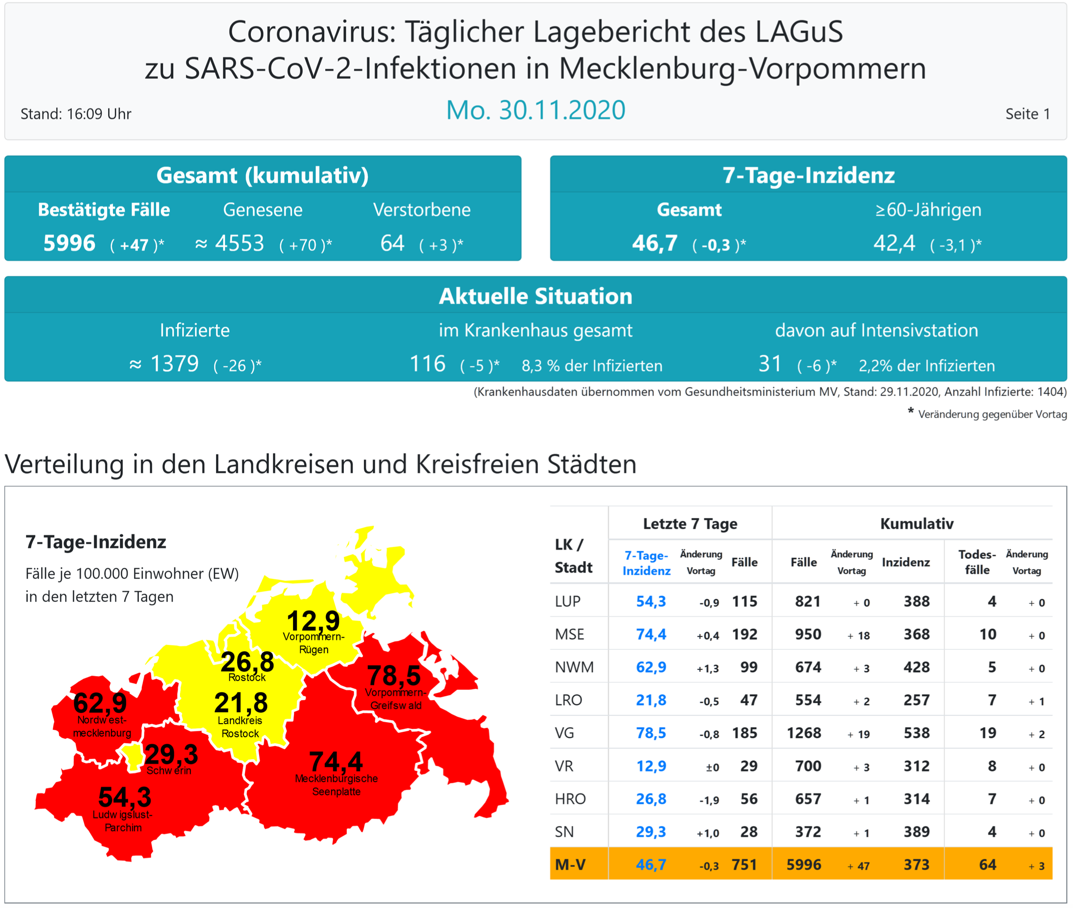 Insgesamt wurden in MV bisher 5996 Infektionen festgestellt. Laut einer Schätzung des Robert Koch-Instituts (RKI) sind in Mecklenburg-Vorpommern 4553 der positiv getesteten Menschen von einer Covid-19-Erkrankung genesen. Insgesamt gab es bislang 64 Todesfälle im Lan – drei mehr als gestern.