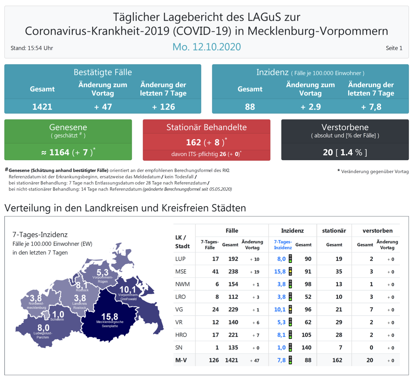 Laut einer Schätzung des Robert Koch-Instituts (RKI) sind in Mecklenburg-Vorpommern 1164 der positiv getesteten Menschen von einer Covid-19-Erkrankung genesen. Insgesamt gab es bislang 20 Todesfälle im Land.
