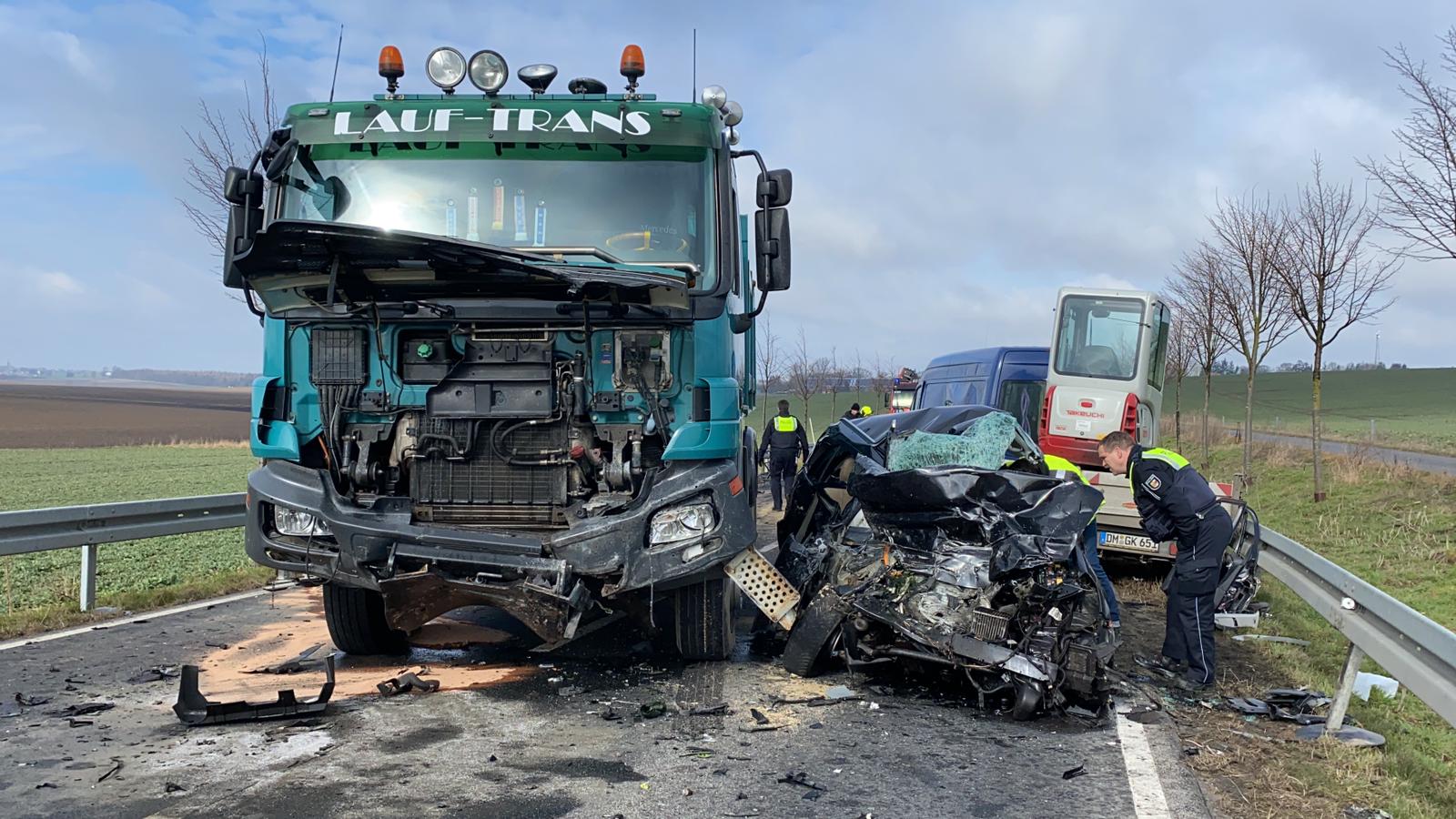 Bei einem Unfall auf der B 104 zwischen Alt Käbelisch und Petersdorf ist heute Vormittag ein Mann ums Leben gekommen. Nach bisherigen Erkenntnissen befuhr der 50-Jährige mit seinem Pkw die B 104 aus Richtung Petersdorf in Richtung Alt Käbelich und wollte den vor ihm fahrenden Transporter mit Anhänger überholen. Dabei bemerkte er den entgegenkommenden Lkw zu spät und geriet beim Wiedereinscheren mit seinem Wagen ins Schleudern.