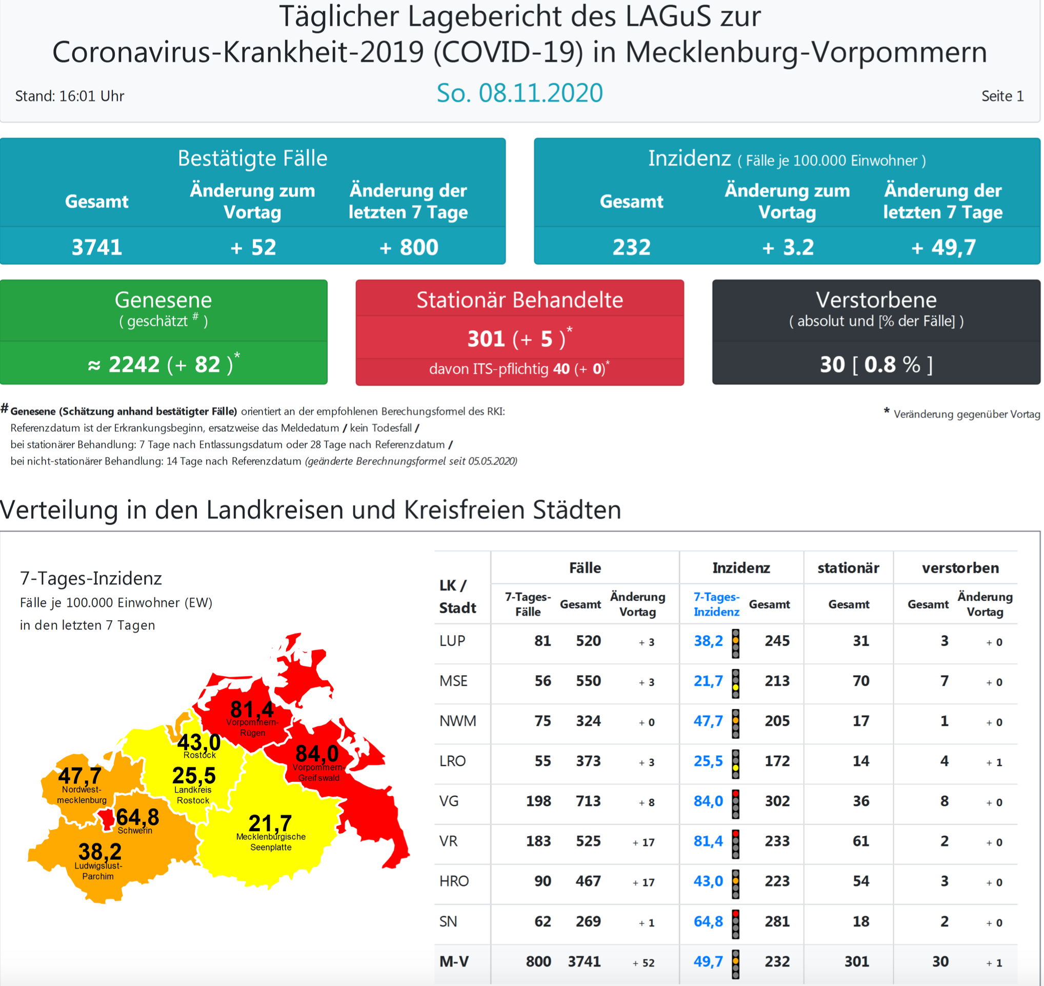 Insgesamt wurden in MV bisher 3741 Infektionen festgestellt.