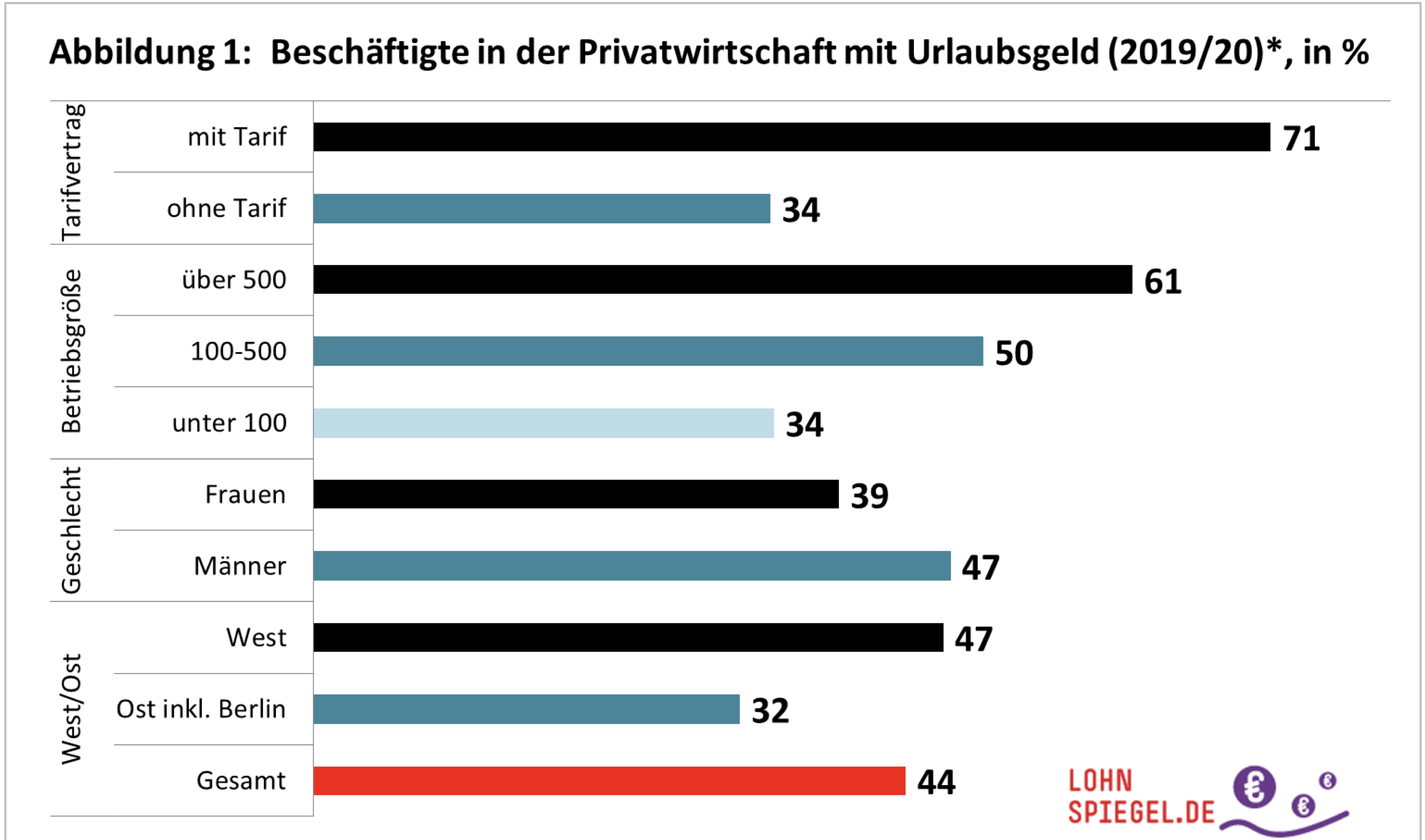In Deutschland erhalten etwas weniger als die Hälfte (44 Prozent) aller Beschäftigten in der Privatwirtschaft Urlaubsgeld. Zu diesem Ergebnis kommt eine aktuelle Online-Befragung des Internet-Portals Lohnspiegel.de, das vom Wirtschafts- und Sozialwissenschaftlichen Institut (WSI) der Hans-Böckler-Stiftung betreut wird. Für die Analyse wurden die Angaben von mehr als 53.000 Beschäftigten aus dem Zeitraum von Anfang August 2019 bis Ende Mai 2020 ausgewertet.