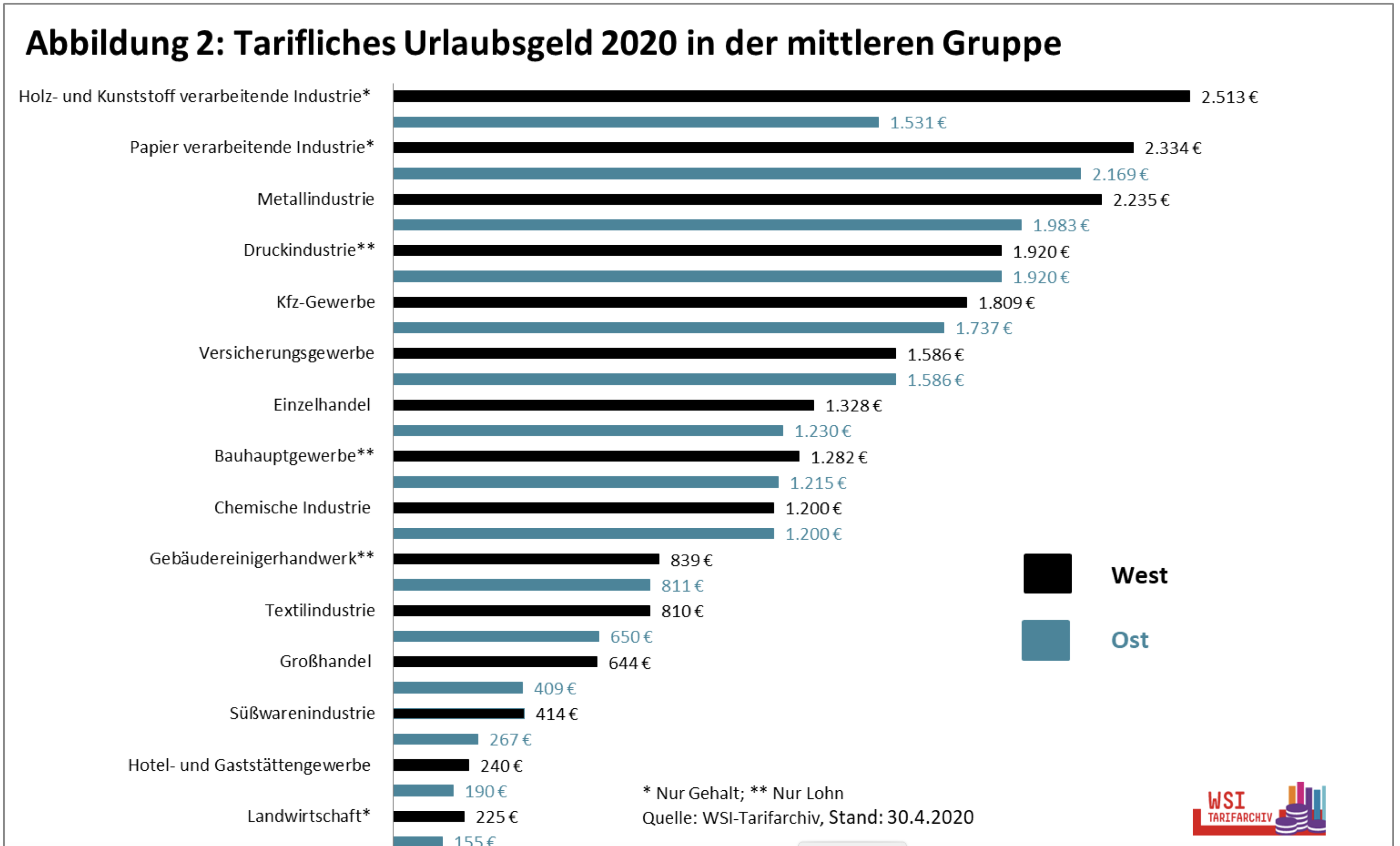 Am wenigsten Geld Urlaubsgeld bekommen Beschäftigte in der Landwirtschaft und im Hotel- und Gaststättengewerbe. Die höchsten Zahlungen erhalten Arbeitnehmer unter anderem in der Holz- und Kunststoffverarbeitung, der Metallindustrie, der Papier verarbeitenden Industrie, dem Kfz-Gewerbe, der Druckindustrie, im Versicherungsgewerbe, dem Einzelhandel, der Bauindustrie und in der Chemischen Industrie.