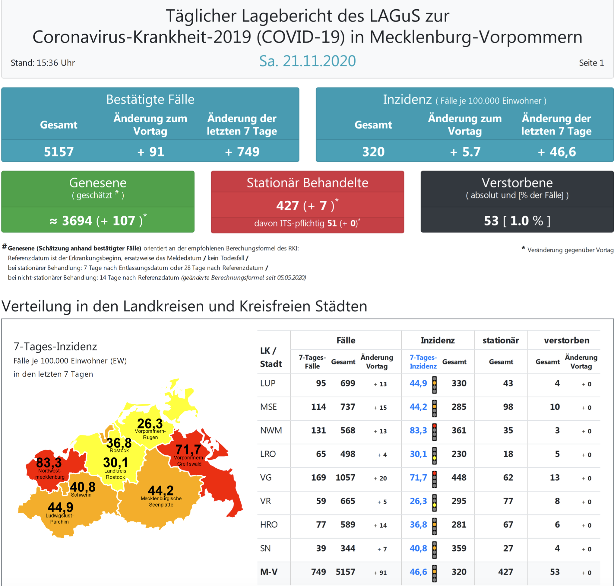 Insgesamt wurden in MV bisher 5157 Infektionen festgestellt. Laut einer Schätzung des Robert Koch-Instituts (RKI) sind in Mecklenburg-Vorpommern 3694 der positiv getesteten Menschen von einer Covid-19-Erkrankung genesen. Insgesamt gab es bislang 53 Todesfälle im Land.