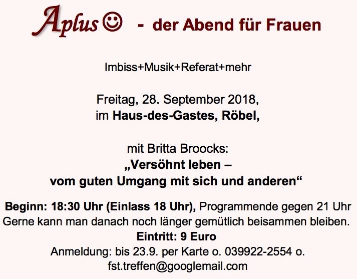 „APlus – der Abend für Frauen“ heißt es am kommenden Freitag, 28. September, ab 18.30 Uhr im Haus des Gastes in Röbel. Referentin Britta Broocks spricht zum Thema „Versöhnt leben – Im guten Umgang mit sich und anderen“.
