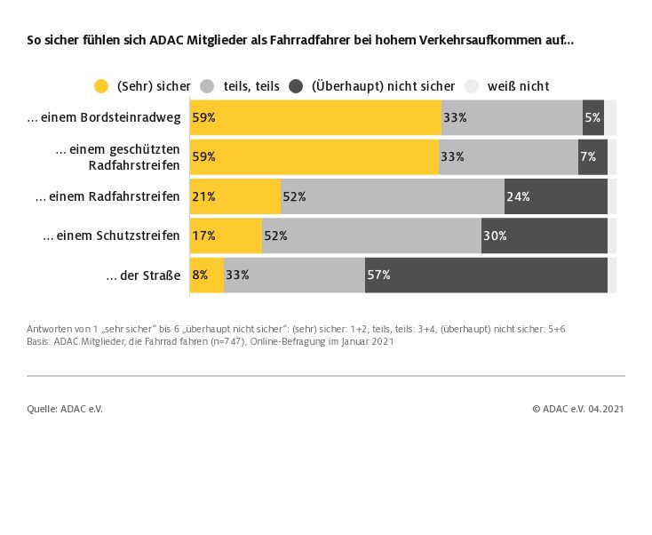 Eine Umfrage des ADAC zur Sicherheit beim Fahrradfahren zeigt, dass Radfahrer sich vor allem dort sicher fühlen, wo Radwege baulich von der Fahrbahn abgegrenzt sind. Die Trennung kann in Form eines Bordsteins zwischen Radweg und Fahrbahn oder durch Barrieren zwischen Fahrbahn und Radfahrstreifen erreicht werden. Jeweils 59 Prozent gaben an, sich so am sichersten zu fühlen. Unsicher fühlen sich Radfahrer vor allem auf der Fahrbahn zusammen mit dem Kfz-Verkehr (57 Prozent). Nur acht Prozent gaben an, sich hier sicher zu fühlen. Auch auf markierten Schutz- oder Radfahrstreifen fühlen sie sich eher unwohl (30 bzw. 24 Prozent). Daher empfiehlt der ADAC, Radfahrer entlang von Hauptverkehrsstraßen möglichst auf baulich getrennten Wegen zu führen.