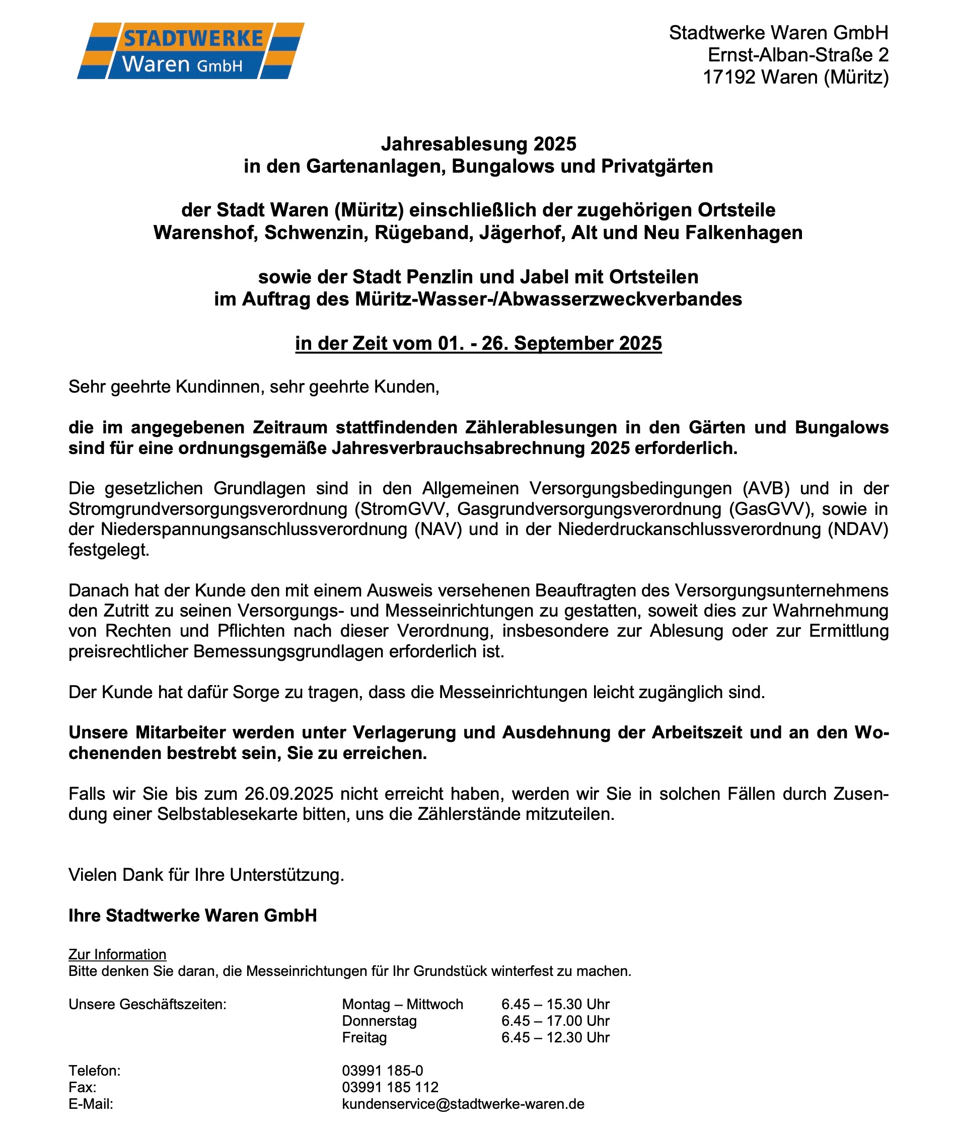 Wichtige Mitteilung der Warener Stadtwerke:
