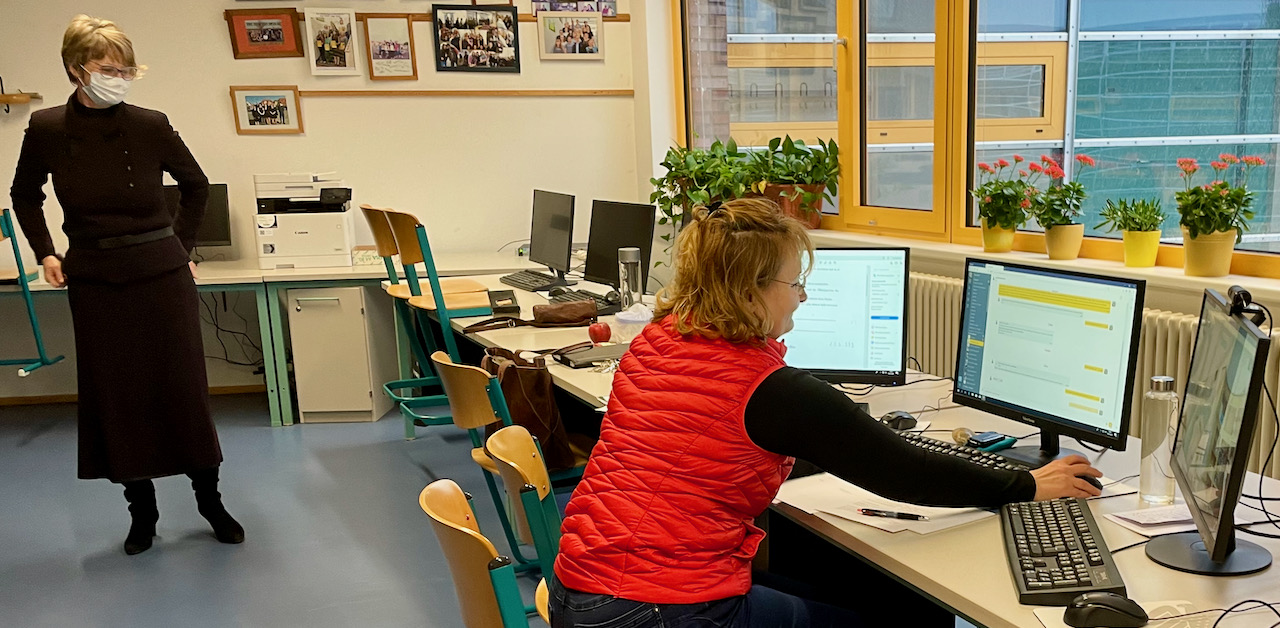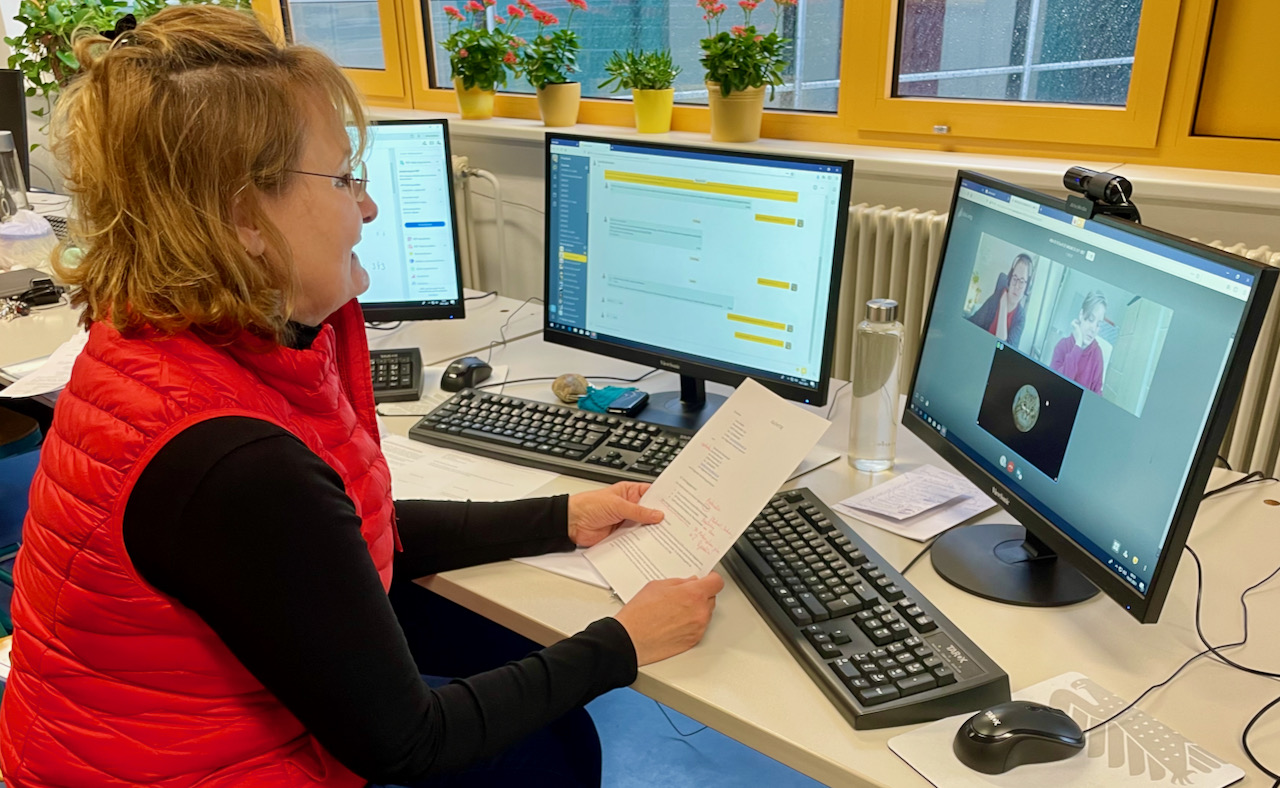 Nelly Halster ist eine Lehrerin, die gegenwärtig in einem Klassenraum des Zentrum sozusagen die Stellung hält. Auf drei Rechnern behält sie den Überblick darüber, was ihre Schüler, die später im Medien-Informationsdienst tätig sein wollen, gerade machen. „Das ist natürlich alles sehr gewöhnungsbedürftig, aber es klappt. Die Schüler ziehen gut mit“, berichtet die Lehrerin. Ihre Konzepte für den Unterricht könne sie aber nicht 1:1 übertragen. Vielmehr müssen sie für die Online-Variante geändert und angepasst werden. „Im Vergleich zum ersten Lockdown ist der Online-Unterricht, den wir jetzt anbieten können, ein Riesen-Fortschritt, wir nutzen die Möglichkeiten voll aus“, sagt Nelly Halster.