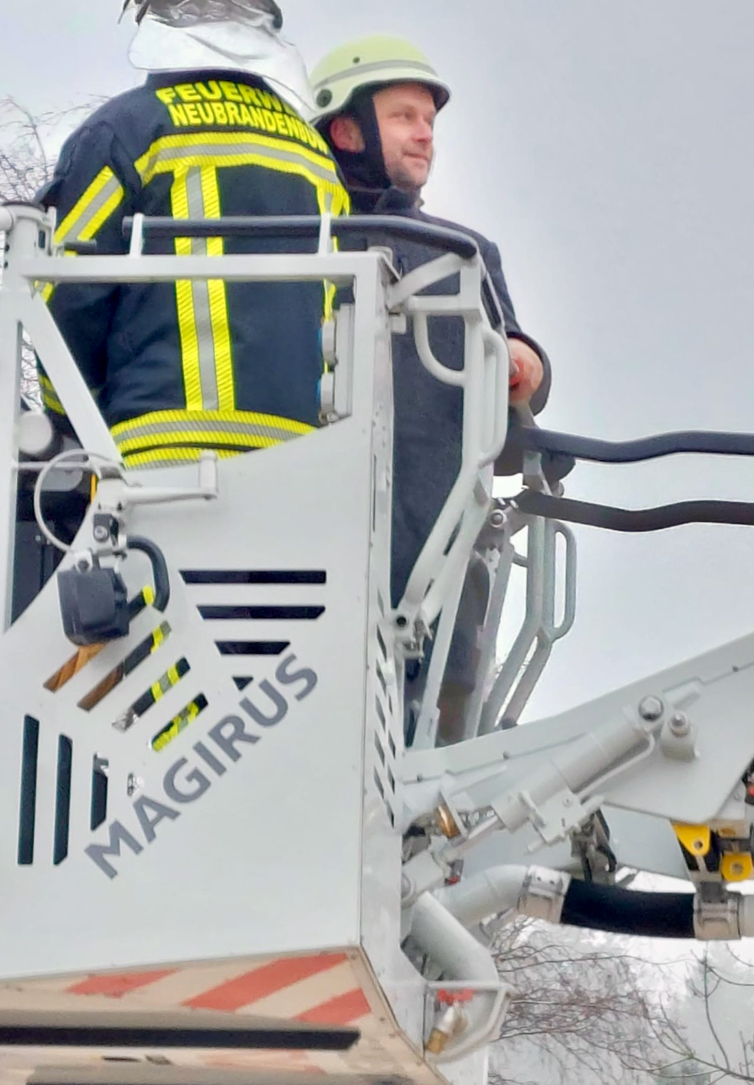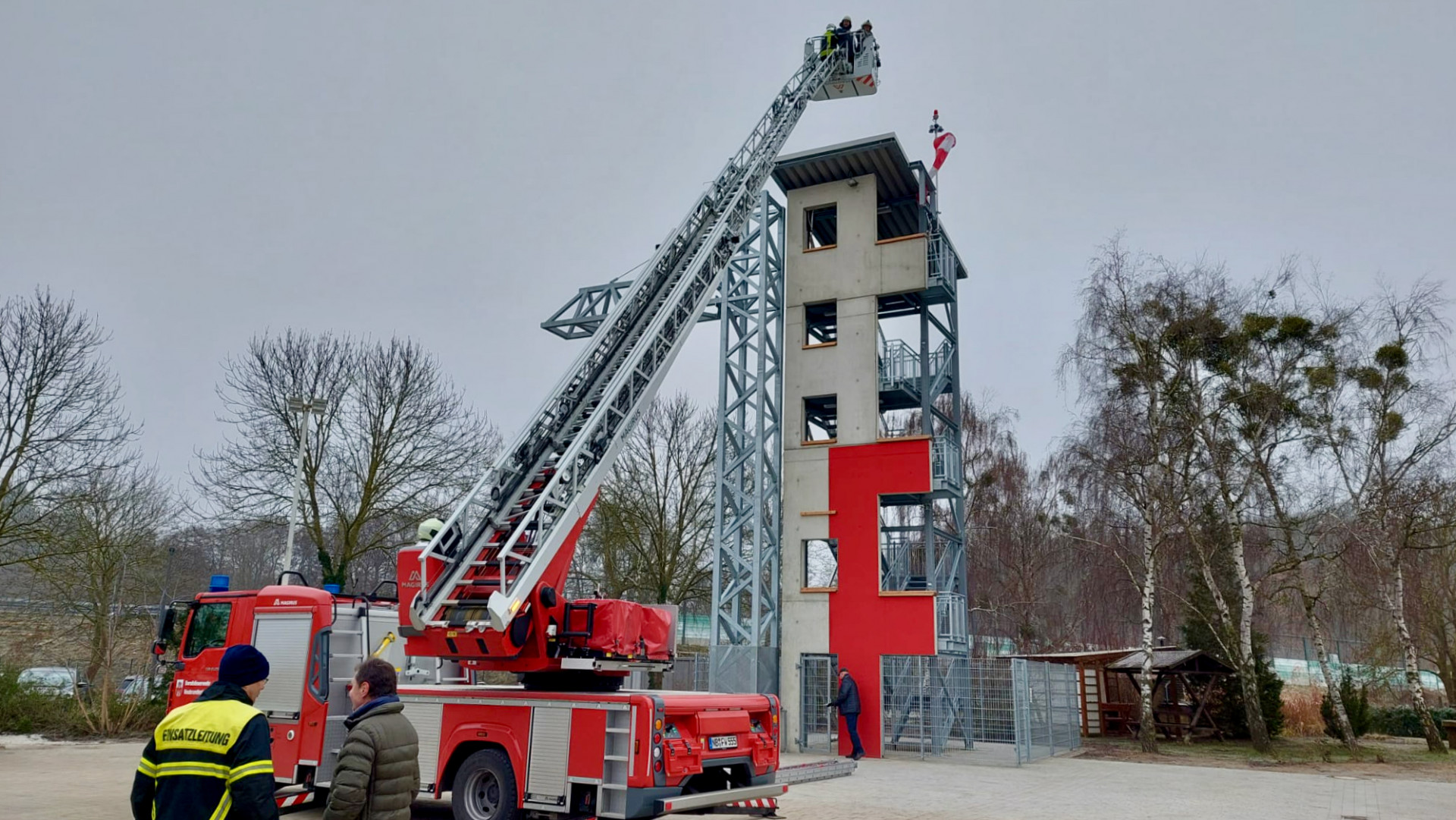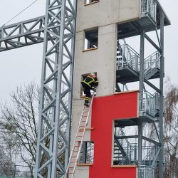 Denn die Berufsfeuerwehr, die bei schwierigen Lagen auch im gesamten Landkreis Mecklenburgische Seenplatte zum Einsatz kommt, braucht ständig einsatzbereite Technik und trainierte Leute. Ihr gehören mehr als 90 Frauen und Männer an. So kann am vierstöckigen Turm auch das schnelle Anlegen von Leitern unterschiedlichster Art trainiert werden. Das passierte dann auch bei der Übergabe. Der schmale Übungsturm besteht aus einer Mischung aus Betonelementen und mehreren verzinkten Treppen, die an einen Aufstieg zu einem Aussichtsturm, wie am Tiefwarensee erinnern.