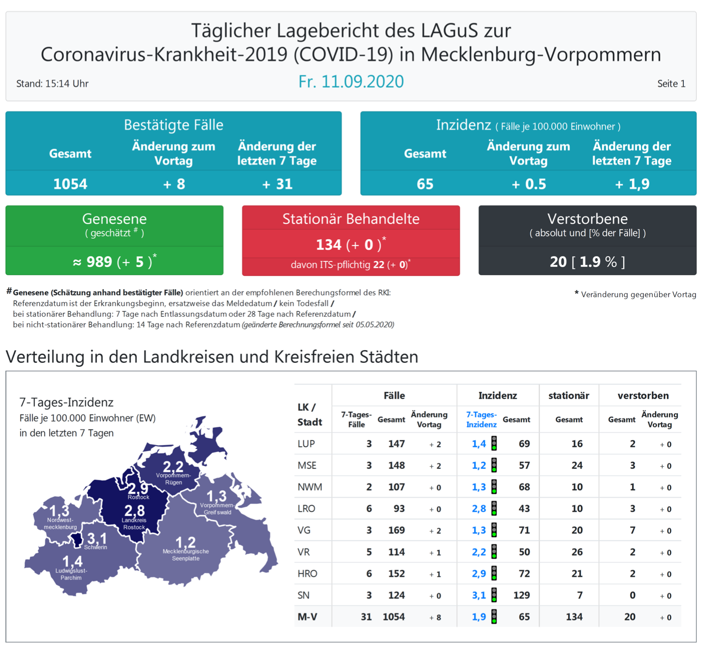 Laut einer Schätzung des Robert Koch-Instituts (RKI) sind in Mecklenburg-Vorpommern 989 der positiv getesteten Menschen von einer Covid-19-Erkrankung genesen. Insgesamt gab es bislang 20 Todesfälle im Land.