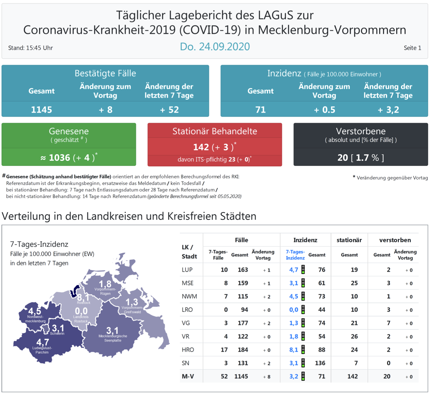 Landesweit müssen oder mussten den Angaben zufolge 132 Menschen in Kliniken behandelt werden, 23 (+0) von ihnen auf Intensivstationen.