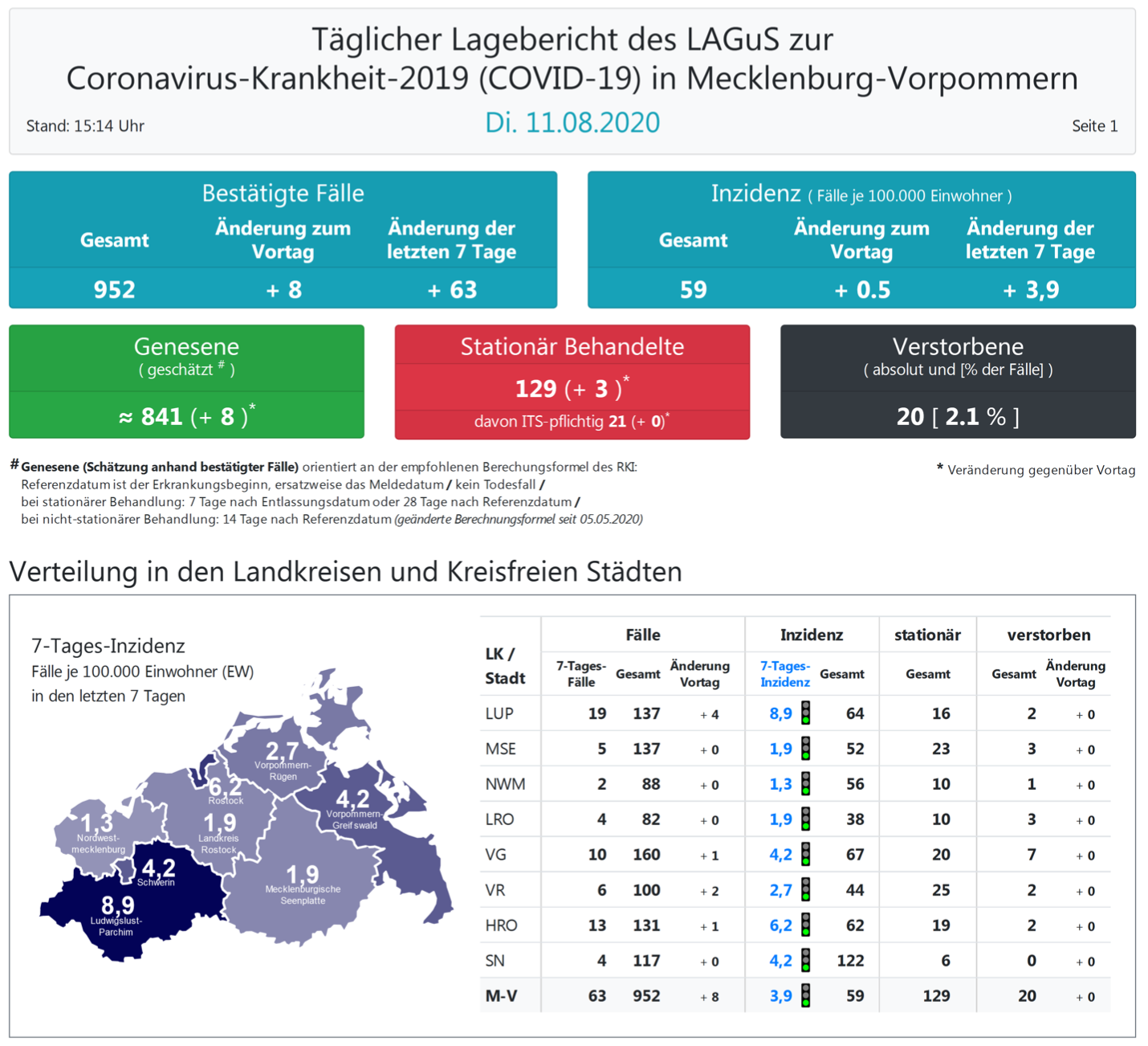 Landesweit müssen oder mussten den Angaben zufolge 129 (+3) Menschen in Kliniken behandelt werden – 21 von ihnen auf Intensivstationen.