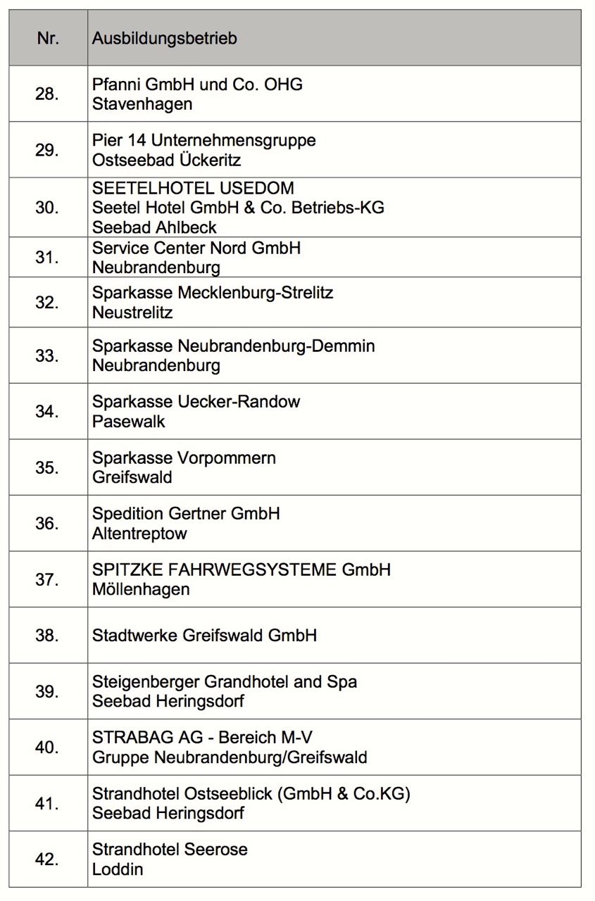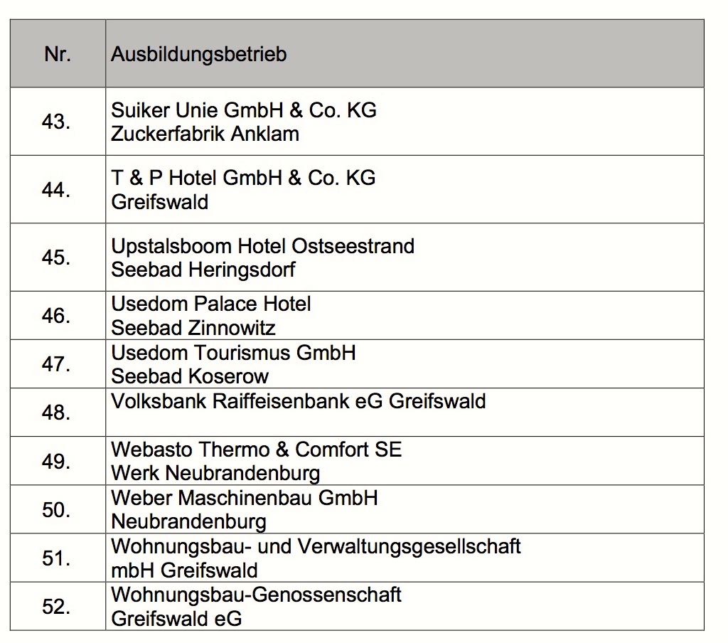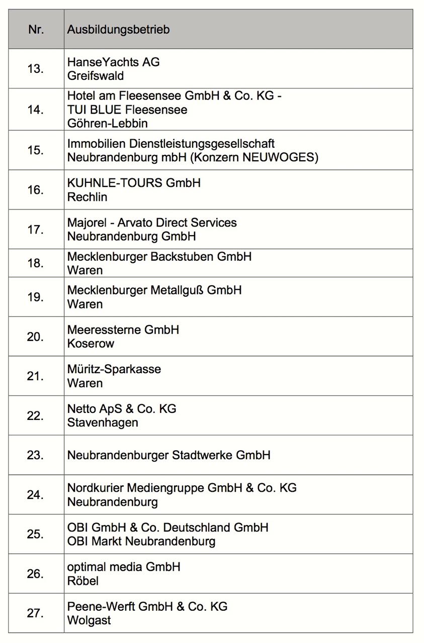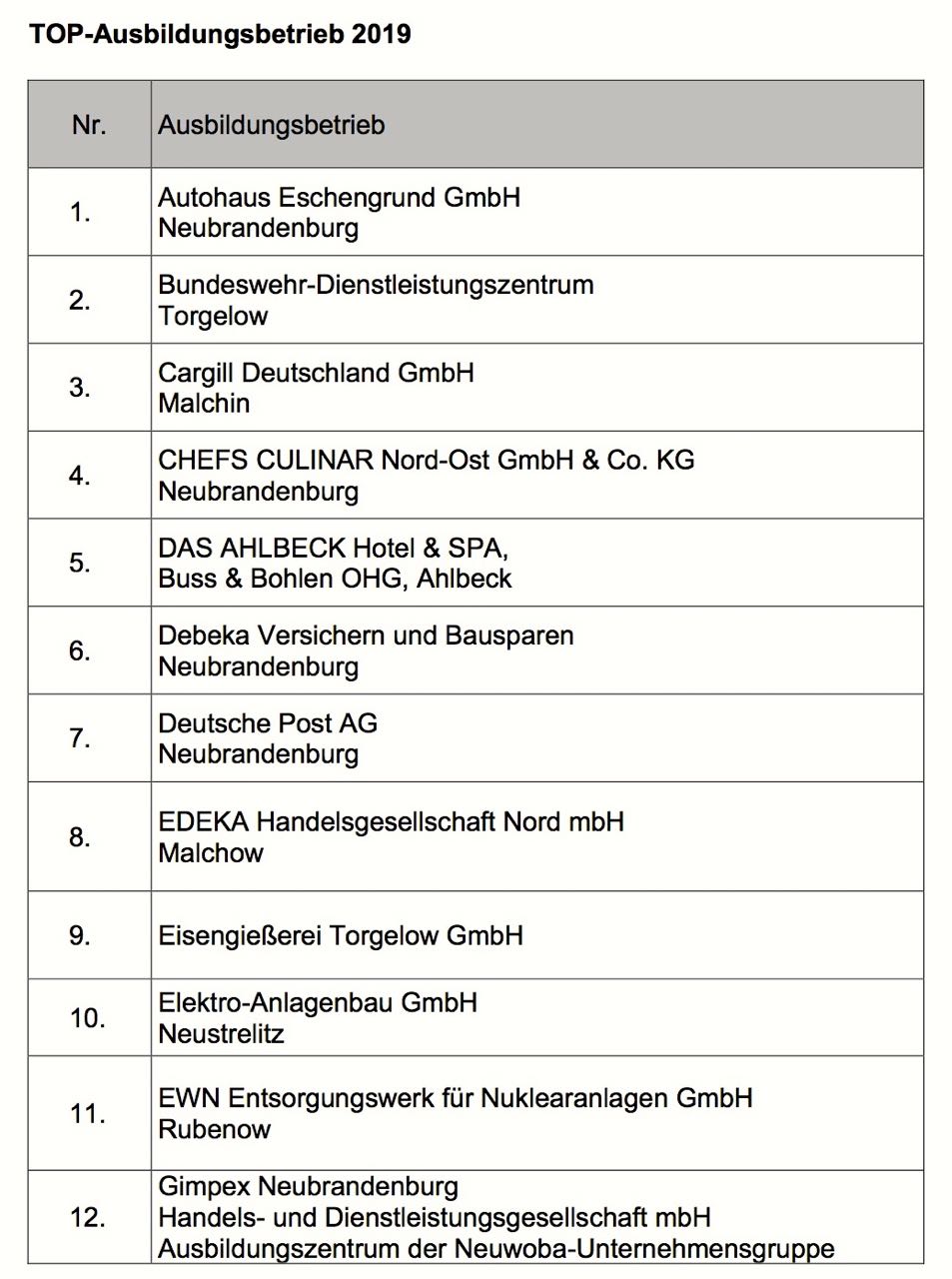 Die IHK Neubrandenburg hat gestern 52 Unternehmen ausgezeichnet und mit den Titel „TOP-Ausbildungsbetrieb 2019“ geehrt. Zu diesen Unternehmen gehören auch acht aus der Müritz-Region. Und zwar die EDEKA Handelsgesellschaft Nord mbH Malchow, TUI Blue Fleesensee, Kuhnle-Tours Rechlin, Mecklenburger Backstuben GmbH, Mecklenburger Metallgusswerk GmbH, die Müritz-Sparkasse, die optimal media GmbH Röbel und die Spitzke Fahrwegsysteme GmbH Möllenhagen. Viele dieser Unternehmen haben diese Auszeichnung bereits mehrfach erhalten.