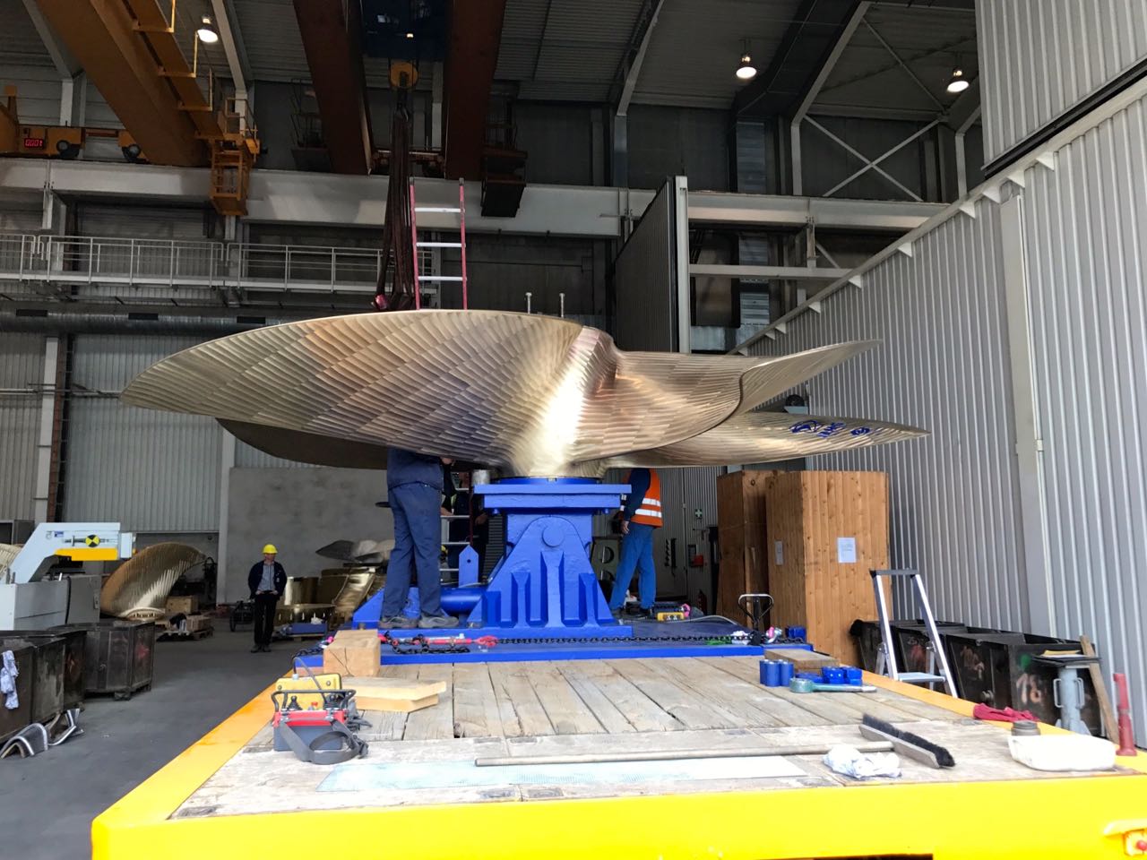Er wird gerade befestigt, um 15.30 Uhr geht’s dann los zur Müritz Sail. In diesem Jahr nimmt der Ausstellungspropeller des Mecklenburger Metallgusswerkes wegen der Bauarbeiten in der Goethestraße aber einen anderen Weg.