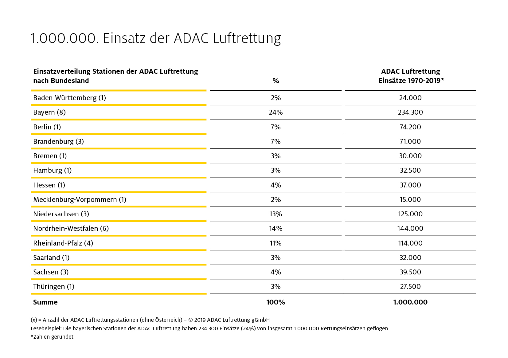 Historischer Tag für die Luftrettung in Deutschland: Die gemeinnützige ADAC Luftrettung aus München ist am Dienstag den millionsten Einsatz seit 1970 geflogen – eine im Rettungsdienst aus der Luft bisher unerreichte Zahl. Das Einsatzspektrum der fliegenden Gelben Engel reichte an diesem Tag von einem hochspezialisierten Intensivtransport in Aschaffenburg bis zu einem Kindernotfall auf den ostfriesischen Inseln. Die meisten der 1.000.000 Einsätze flogen seit 1970 die Stationen in Bayern. Die Hubschrauber an den Standorten Ochsenfurth, Bayreuth, Dinkelsbühl, Ingolstadt, Augsburg, München, Murnau und Straubing hoben rund 234.300 Mal ab gefolgt von Nordrhein-Westfalen mit 144.000, Niedersachsen mit 125.000 und Rheinland-Pfalz mit 114.000 Einsätzen. In diesen Bundesländern sind auch die meisten Stationen beheimatet. Von den 1.000.000 Einsätzen flog „Christoph 31“ in Berlin mit rund 74.200 die meisten Einsätze. Platz zwei geht an „Christoph 1“ in München mit rund 61.000, den dritten Rang belegt „Christoph 20“ in Bayreuth mit 52.000 Einsätzen.