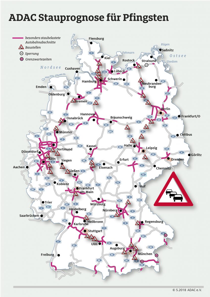 Die massivsten Verkehrsstörungen sind laut ADAC am Freitagnachmittag, 18. Mai, und Pfingstmontag, 21. Mai, zu erwarten.