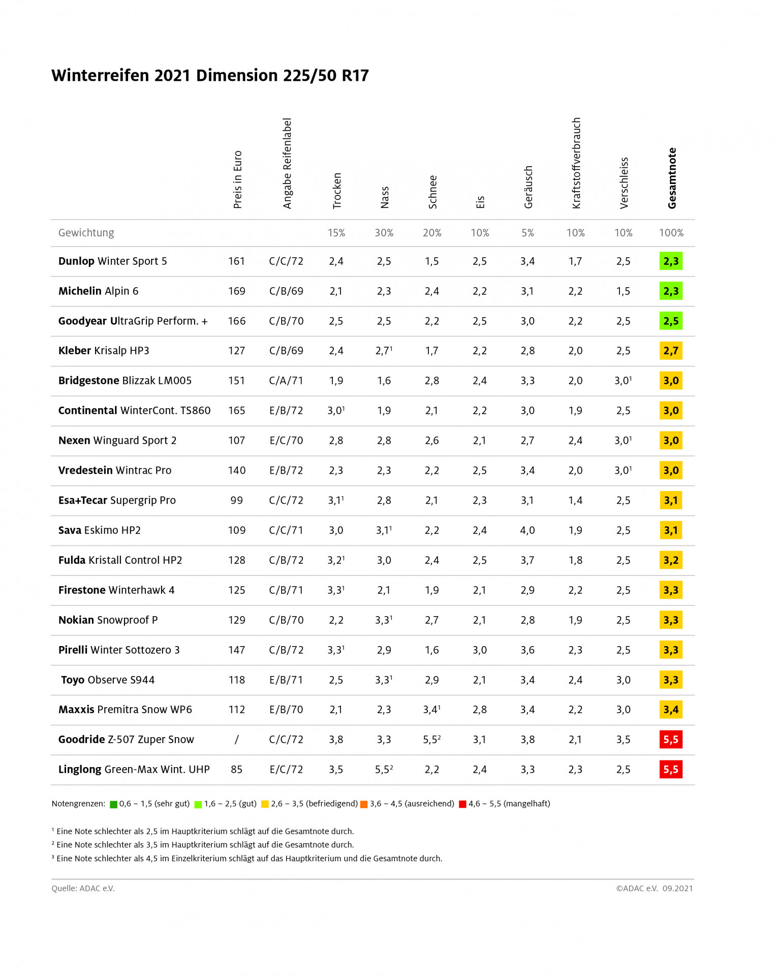 Gemischte Ergebnisse ermittelte der ADAC bei seinem aktuellen Winterreifentest: Bei den 18 Reifen der Dimension 225/50 R17 gab es drei gute Modelle, 13 befriedigende, aber auch zwei mangelhafte. Bei den 16 Reifen der Dimension 195/65 R15 sieht es etwas besser aus: Hier schnitten vier Modelle „gut“ ab, elf „befriedigend“ und eines „ausreichend“. Getestet wurden Winterreifen für Mittelklasse-Pkw wie 3er BMW oder Audi A4 und Modelle für die untere Mittelklasse (Kompaktklasse) wie VW Golf oder Opel Astra.