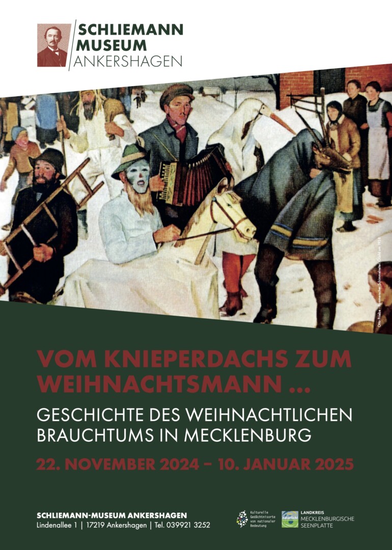 Die traditionelle Adventswerkstatt im Schliemann-Museum Ankershagen öffnet wieder ihre Türen und bietet winterliche Basteleien für die ganze Familie in gemütlicher Atmosphäre. Von festlichen Gestecken bis hin zu vielerlei Adventsschmuck – Am kommenden Sonnabend, 23. November kann beim Familientag von 11 bis 17 Uhr nach Herzenslust gebastelt und alles am Ende natürlich zum Verschenken mit nach Hause genommen werden. Stärken können sich alle Besucher mit Bratwurst vom Grill, Kaffee und Kuchen und heißen Getränken. Eintritt pro Person: 7 Euro. Bereits am Freitag um 14 Uhr wird im Schliemann-Museum die weihnachtliche Ausstellung „Vom Knieperdacks zum Weihnachtsmann… -Geschichte des weihnachtlichen Brauchtums in Mecklenburg“ eröffnet.
