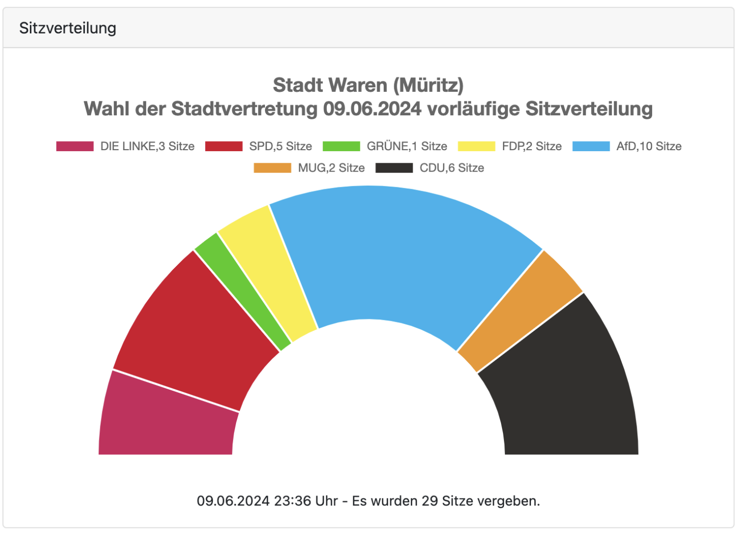 Nach 12 von 22 ausgezählten Stimmbezirken ist auch in der Stadt Waren die AfD klarer Gewinner. Die Partei kann ihr Ergebnis mehr als verdoppeln und dürfte mit neun bis zehn Leuten in die Stadtvertretung einziehen.