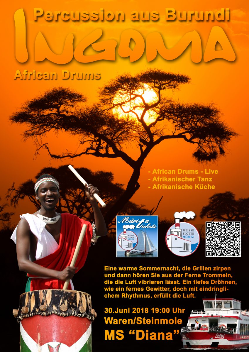 Ingoma – African Drums sind „National Drummers of Burundi“, die als Best-Percussion-Band beim Karneval der Kulturen in Berlin ausgezeichnet wurden. Auf Grund des Erfolgs in Malchow letztes Jahr kommen die Bandmitglieder nochmals exklusiv aus mehreren europäischen Ländern am 30. Juni zusammen an die Müritz nach Waren und am 18. August auf die Oberseenplatte nach Malchow.