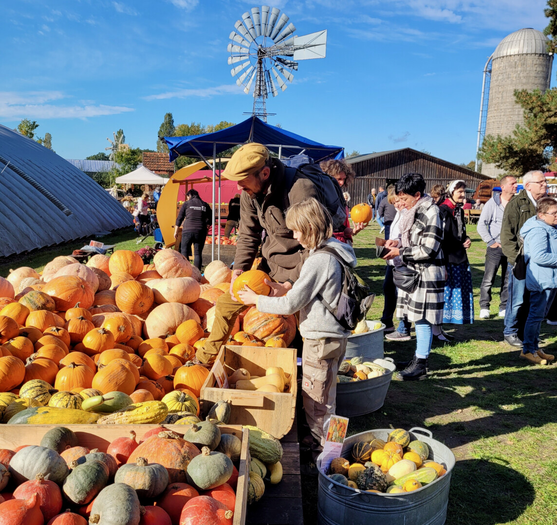 Wer selbst keine Kürbisse anbaut, wird bei der vielfältigen Auswahl am Marktstand fündig und kann für das Kochvergnügen zuhause oder herbstliche Dekorationen seine Auswahl zum Mitnehmen treffen. Kreativ wird es auch in der Kürbis-Werkstatt: Lampions schnitzen, Figuren kreieren und bunte Basteleien stehen hier ganztägig auf dem Programm. Neben den Vorführungen historischer Landmaschinen der Ausstellung wird an diesem Tag auch eine mobile Apfelmosterei präsentieren, wie Äpfel verlesen, gewaschen, gequetscht und gefiltert werden, damit köstlicher Most entstehen kann. Ab 50kg mitgebrachten Äpfeln kann am Ende des Tages sogar eigener Apfelmost mit nach Hause genommen werden.
